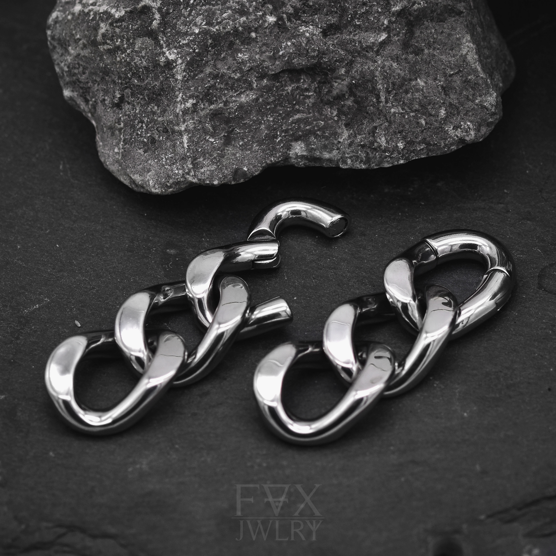 Silver chain ear weights for stretched lobes. Chunky chains combined with a magnetic chain clicker ring. These hangers can fit stretched ears starting at least 6 mm | 2g. This is the minimum required size to wear; you can wear it with all sizes above. Also available in gold.