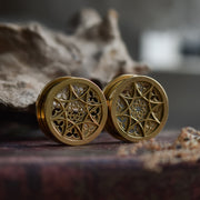 Goldene Kathedralfenster Tunnel für gedehnte Ohrlöcher. Diese Tunnel haben einen bequemen Schraubverschluss auf der Rückseite und ein wunderschönes detailliertes gotisches Rosenfenster auf der Vorderseite. Auch erhältlich in der Farbe Silber.