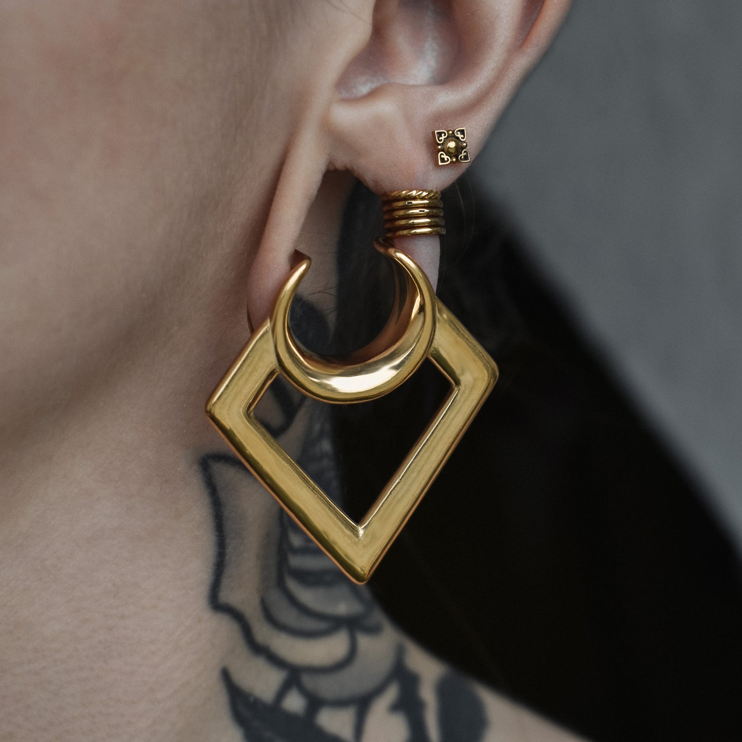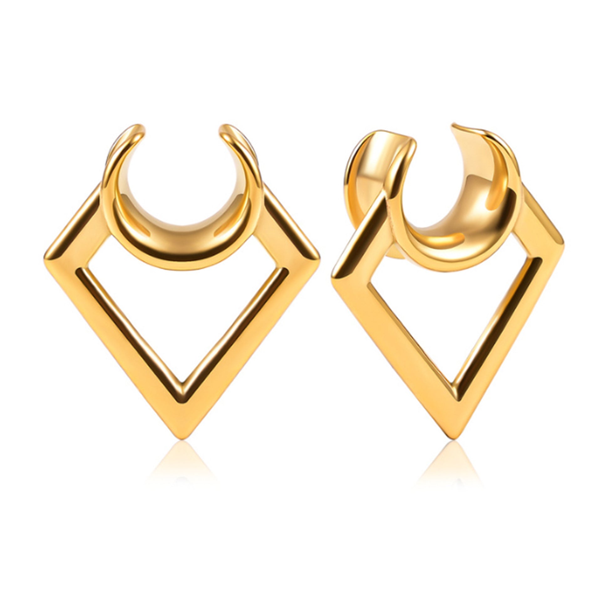 Goldene Diamond Saddle Spreaders für gedehnte Ohrlöcher. Dezente geometrische Diamanten Form Saddle Spreaders mit einem simplen finish. Tragbar ab einer Mindestgröße von 8 mm | 0g und größer. Auch erhältlich in Silber.
