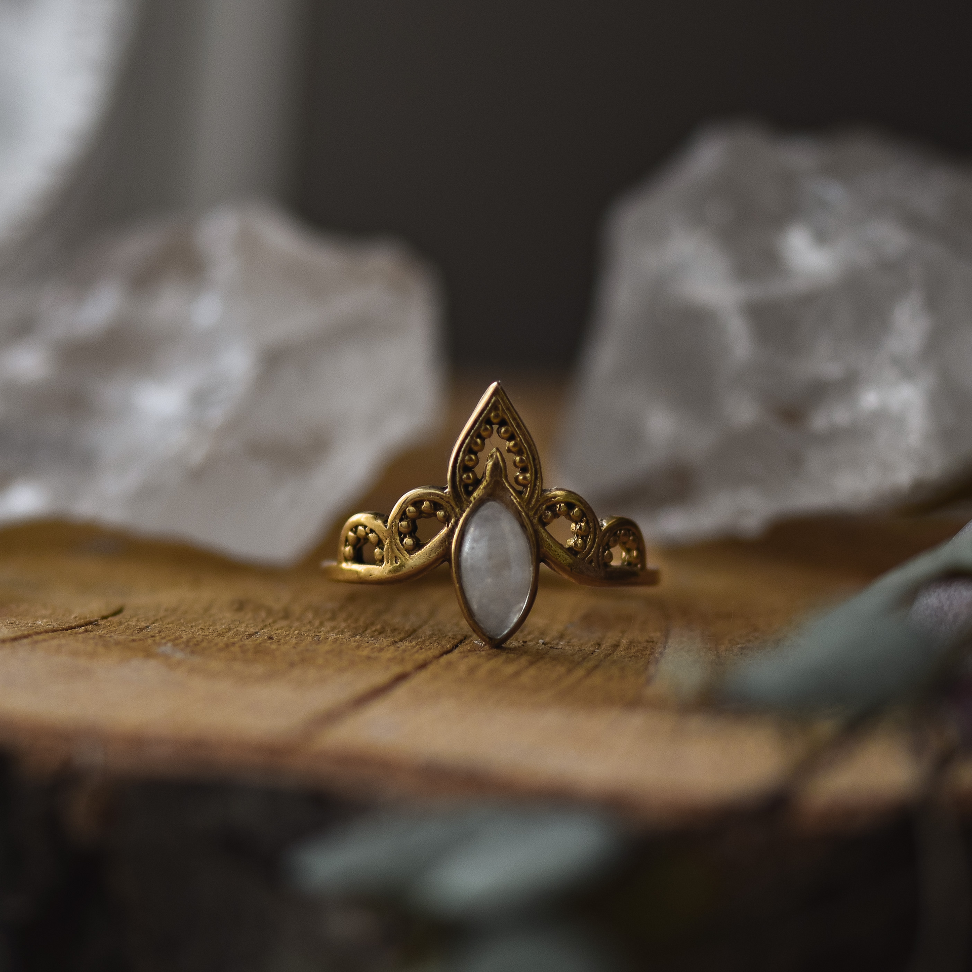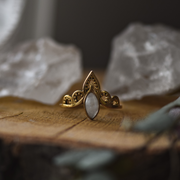 Golden filigree ornament ring featuring a moonstone gemstone.