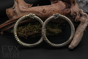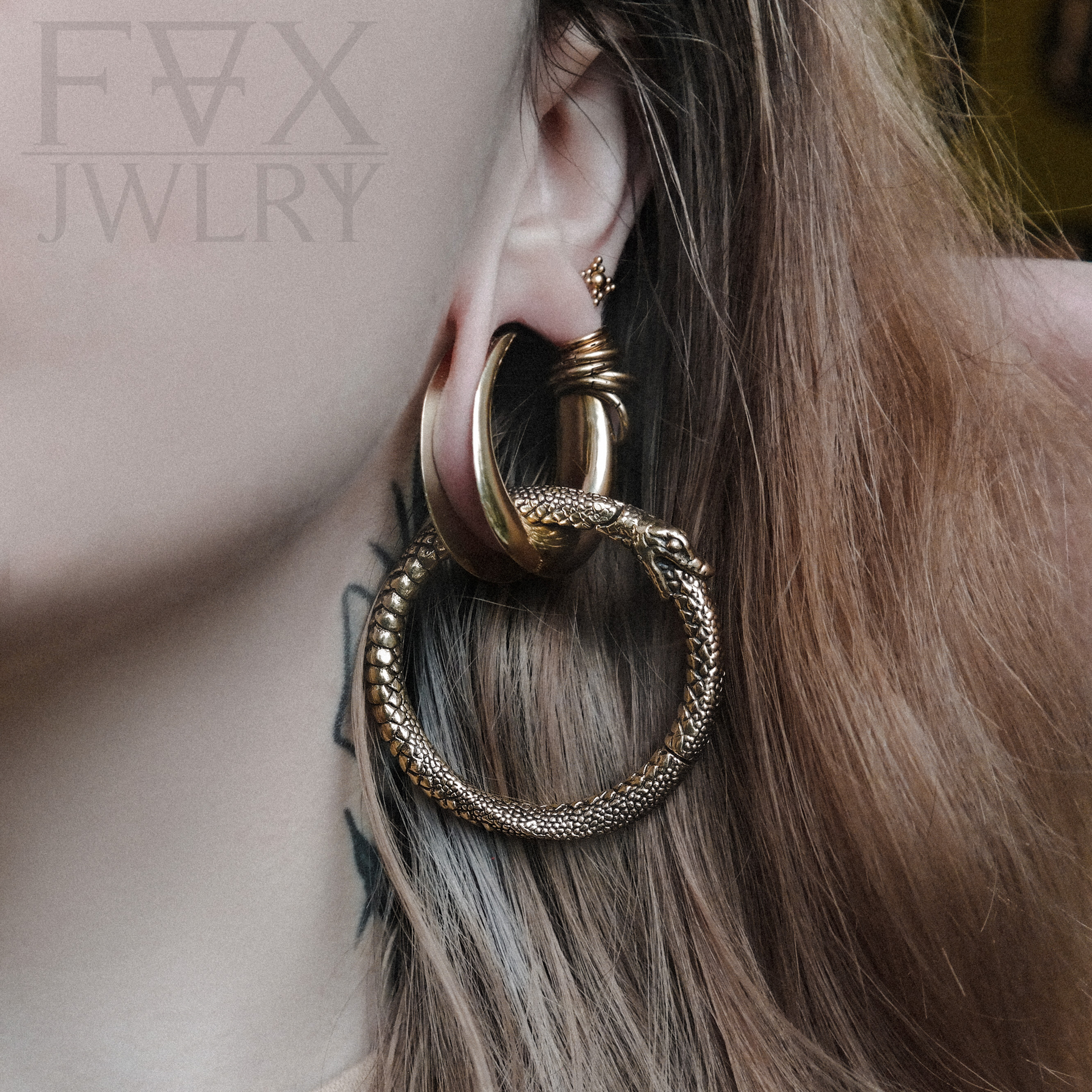 Die Ouroboros Schlangen Ohrgewichte sind ab 6 mm | 2 g und größer tragbar. Die detaillierten Hoops sind sehr angenehm zu tragen und haben einen einfachen Klickverschluss. Auch erhältlich in silber.