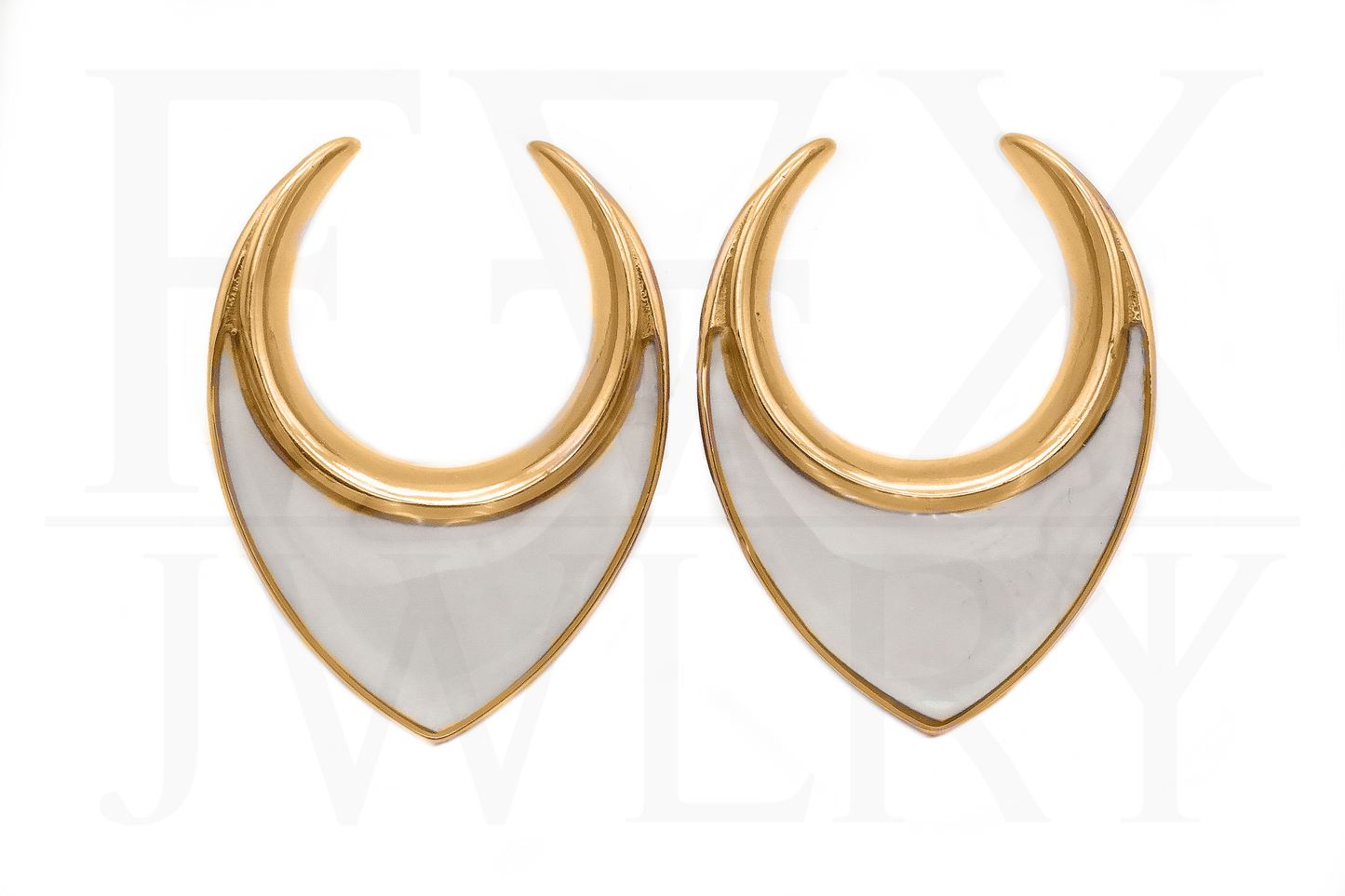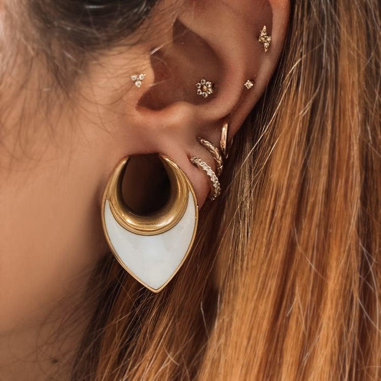 Golden Pearl Ear Hangers for stretched lobes. Saddle weight design with long detailed part. Wearable on all sizes above 8 mm | 0g. Also available in rose gold and silver.