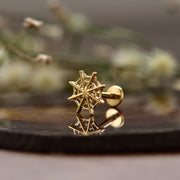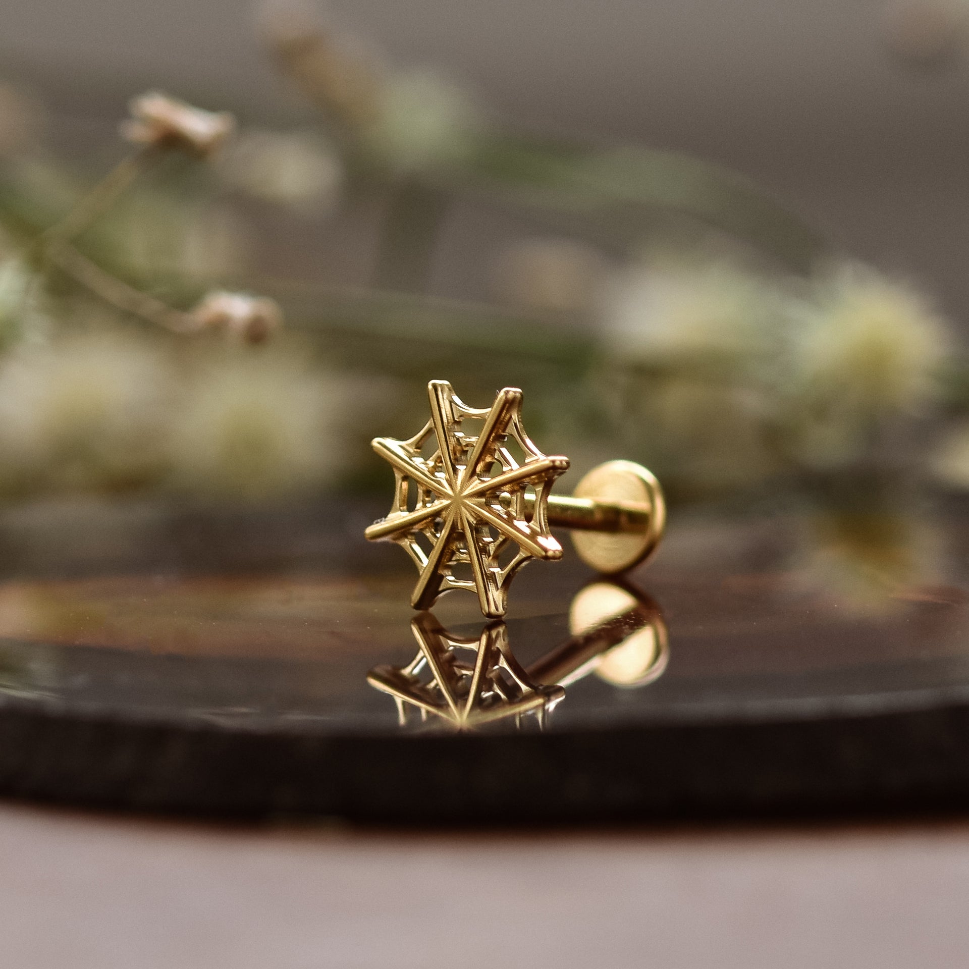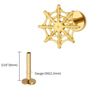 Dieser goldene Spinnennetz Piercing Stecker besteht aus Titan und ist somit besonders hautverträglich.
