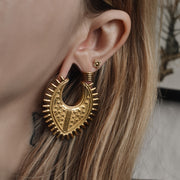 Golden Tribal Shield Saddle Spreaders for stretched ear lobes. Spike ornaments with tribal design. Wearable with size 8 mm | 0g and above.