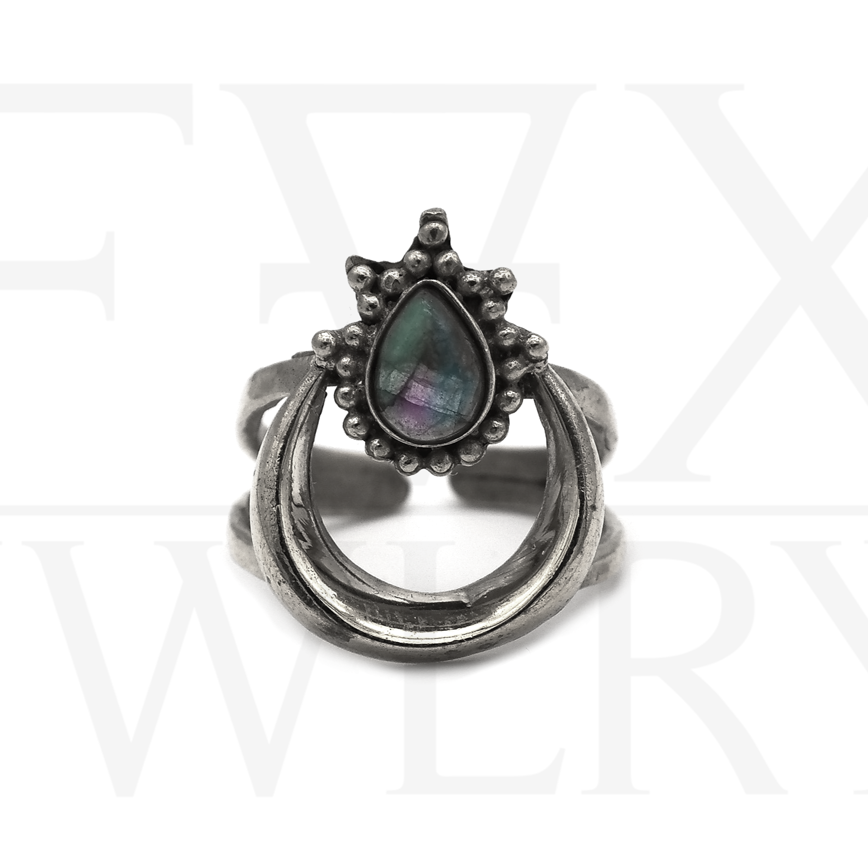 Antik silberner Mondring mit einem verzierten Labradorite Stein. Auch erhältlich in der Farbe Gold.