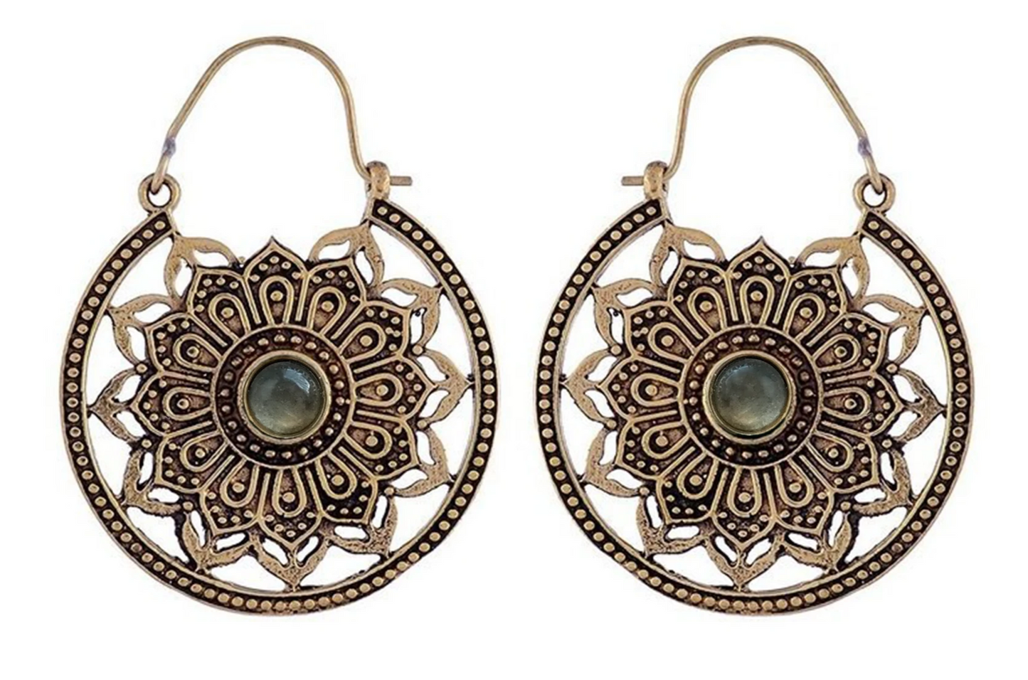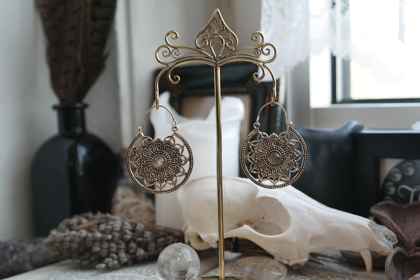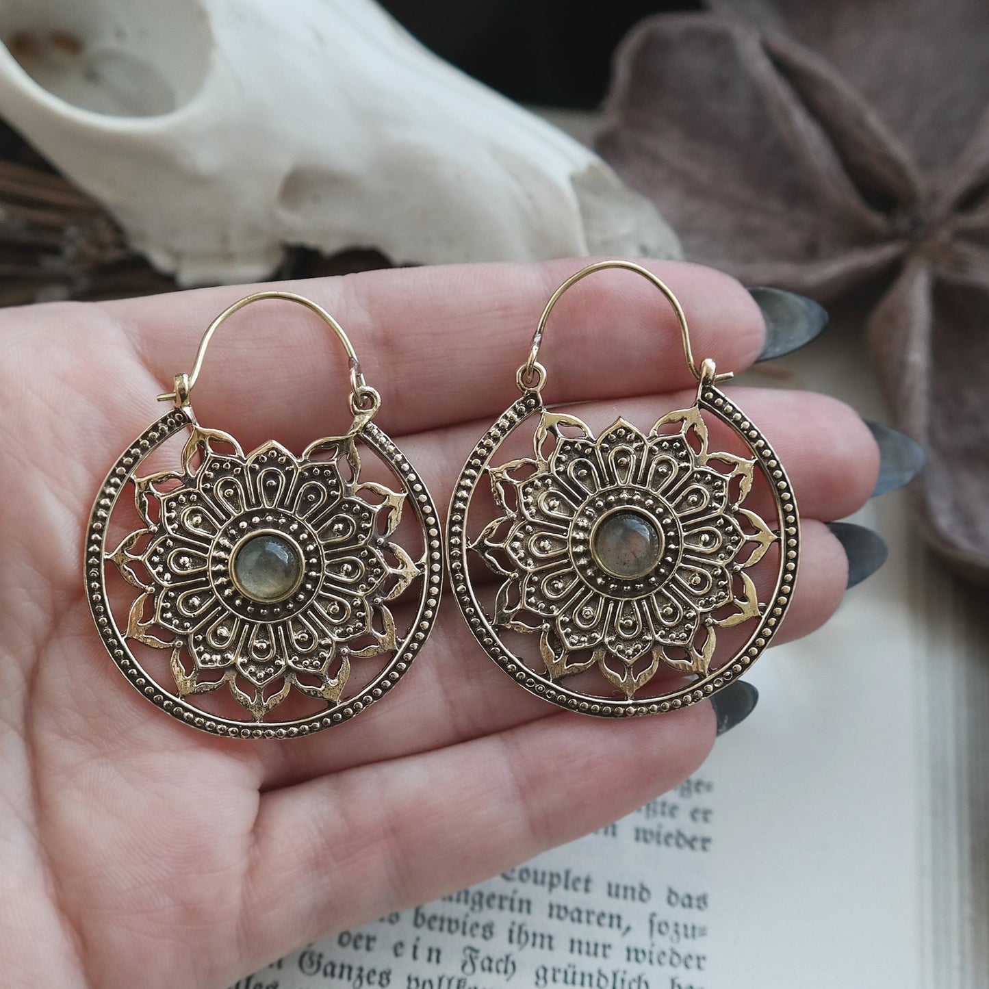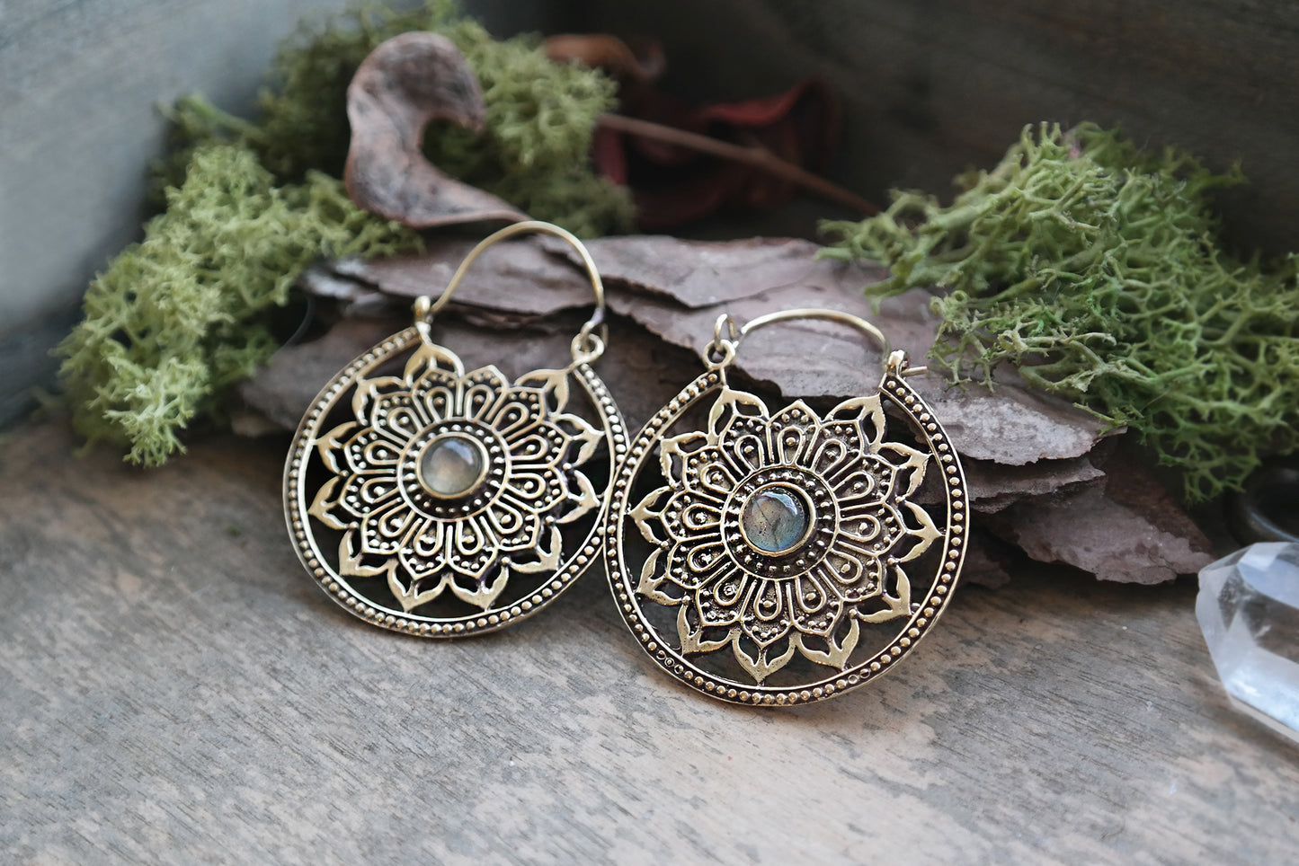 Golden Mandala Hoop Earrings with labradorite stone in the center. They fit comfortable in any flesh tunnel and can be worn like normal earrings.