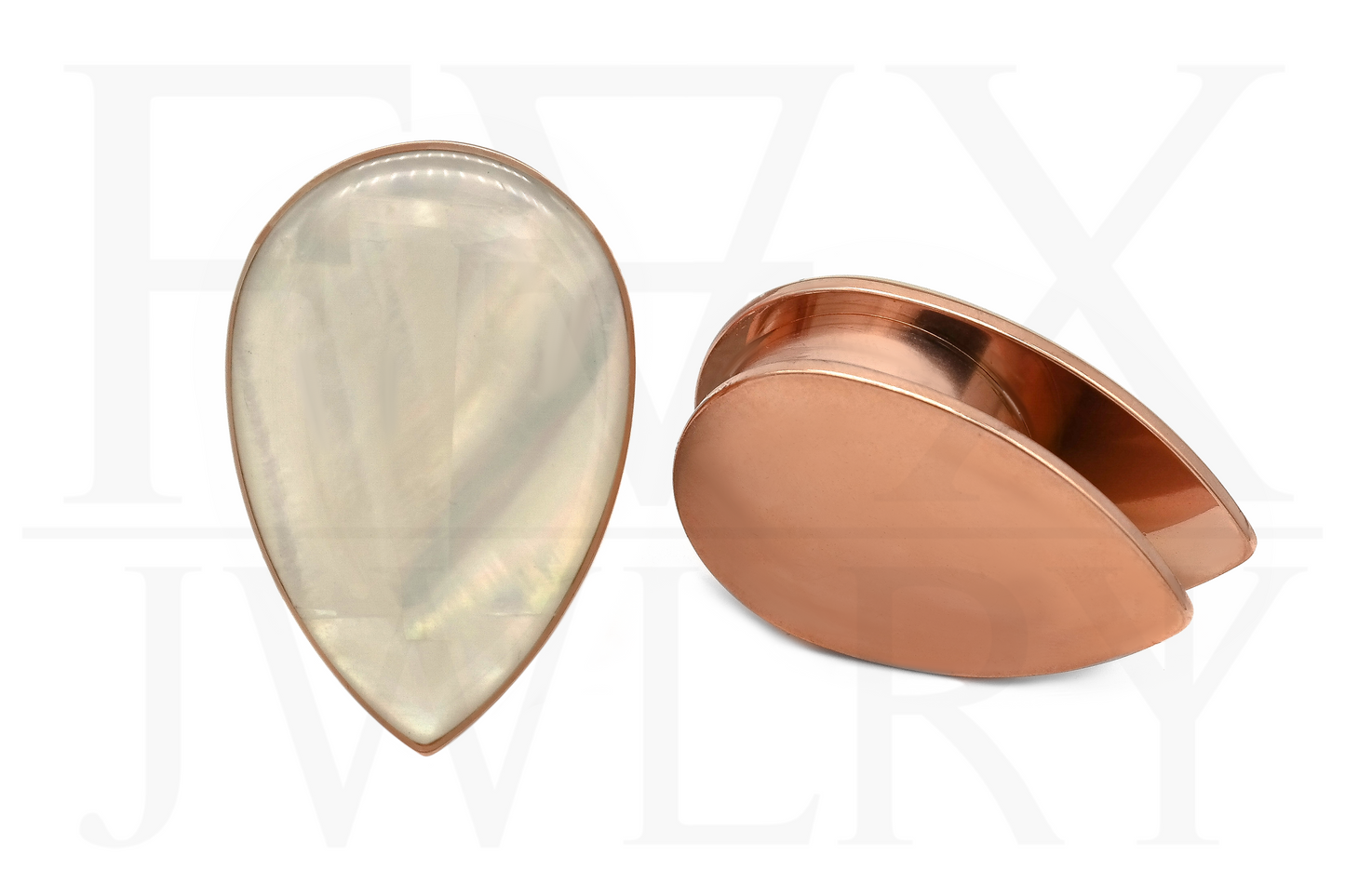 Rose Gold Teardrop Plug Hangers for stretched lobes. Simple plug base with long elements and shiny mother of pearl elements on the front and blanc part on the back. You can insert them like flared plugs. Also available in silver and gold.