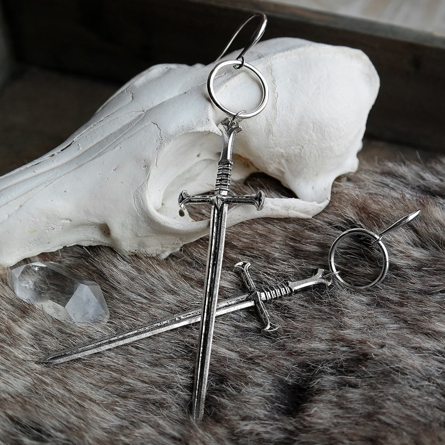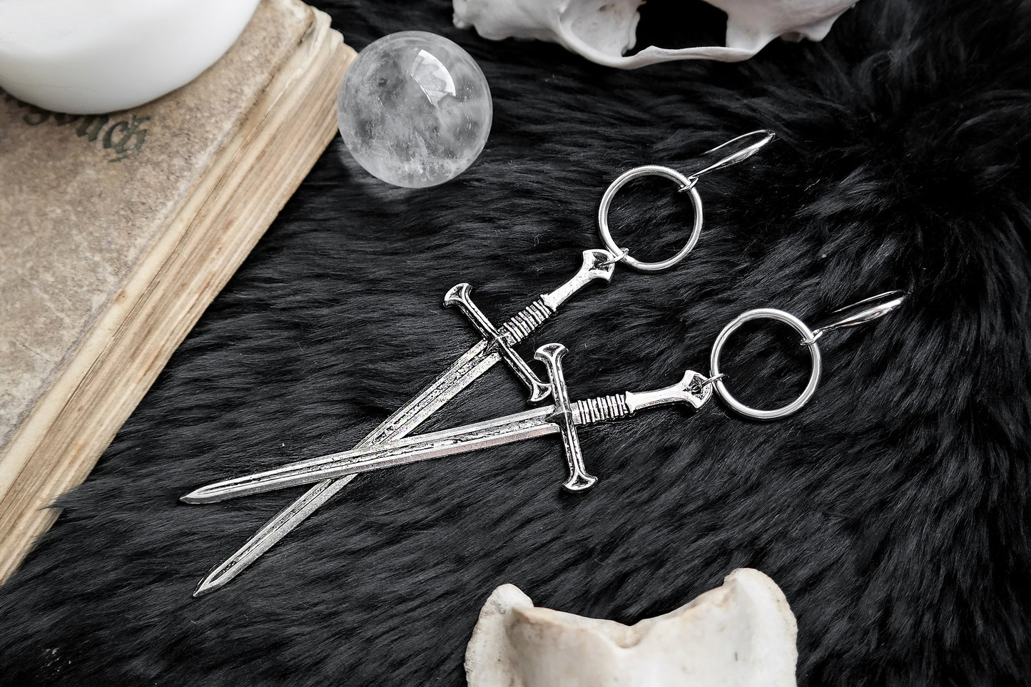 Silver Anduril Sword Earrings. Silver swords hanging on silver rings, combined with stainless steel hooks.