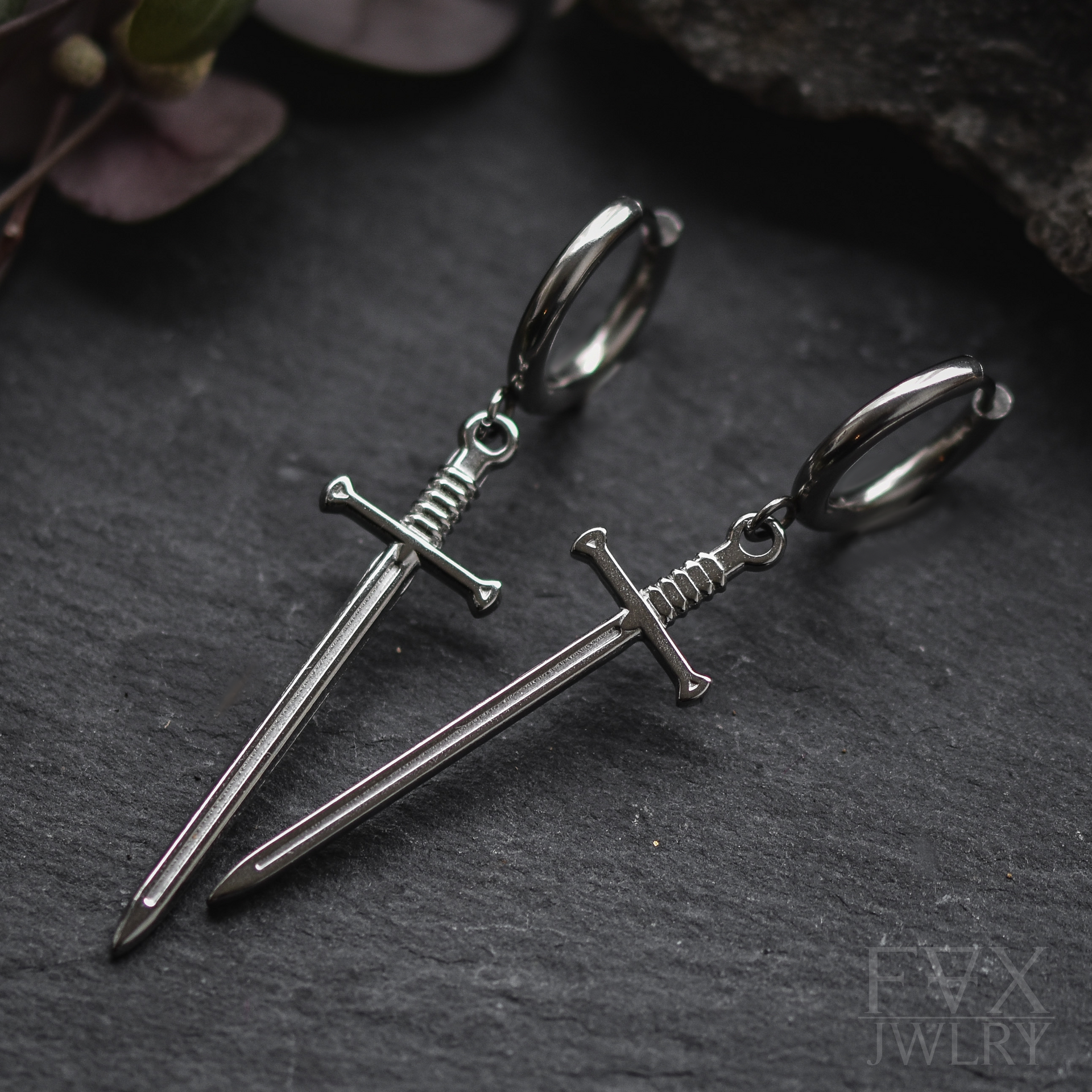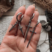Silver Anduril Swords hanging on high quality stainless steel huggie hoops. For standard pierced ears and wearable through flesh tunnels or saddle spreaders. Also available in gold.
