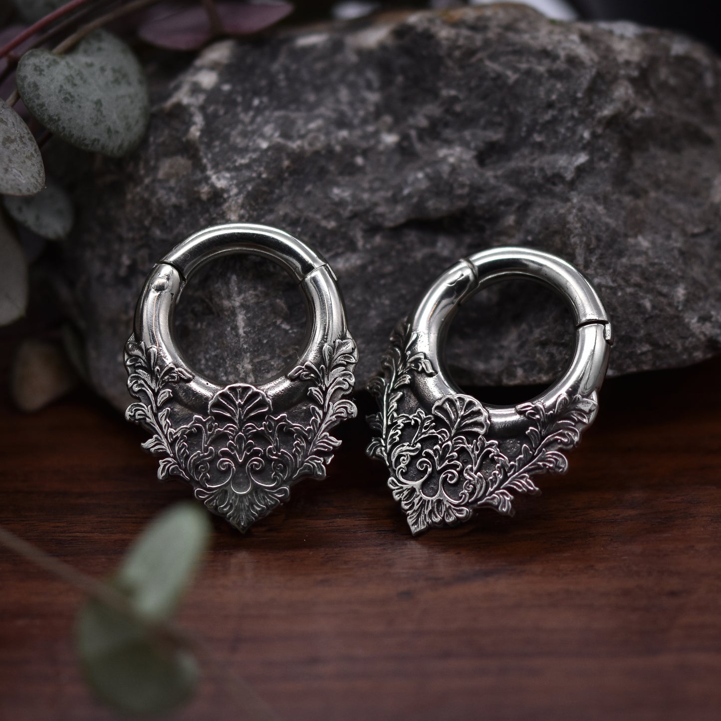 Silberne Barock Klicker Ohrgewichte für gedehnte Ohrlöcher. Diese Hänger passen ab einer Mindestgröße von 4 mm | 6 g und größer. Auch erhältlich in der Farbe Gold.
