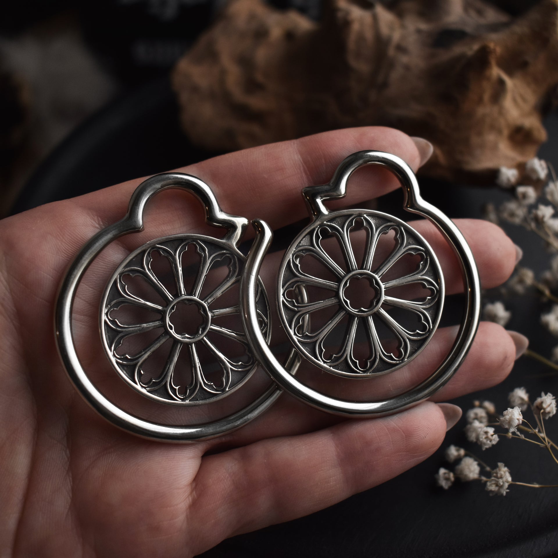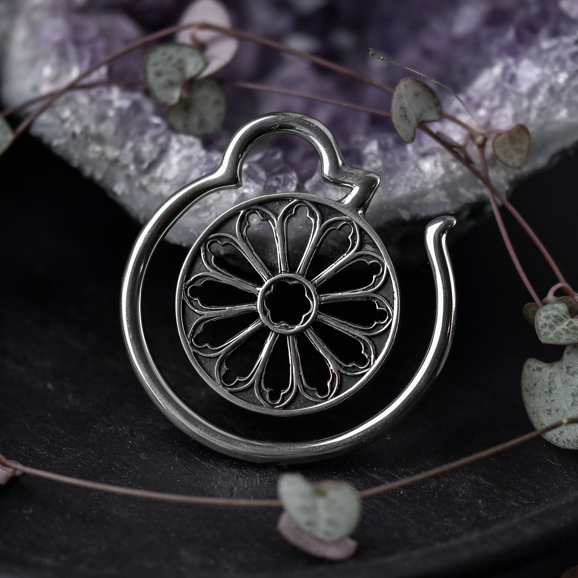 Silberne Kathedralfenster Ohrgewichte für gedehnte Ohrlöcher. Diese Hänger haben wunderschöne detaillierte gotisches Rosenfenster auf beiden Seiten und passen gedehnten Ohrlöchern mit einer Mindestgröße von 4 mm | 6 g und größer. Auch erhältlich in der Farbe Gold.