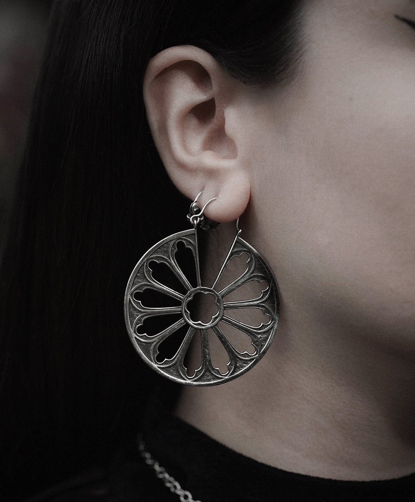 Diese silbernen Kathedralenfenster Ohrringe zeigen ein detailliertes Rosenfenster auf beiden Seiten. Die Hoops sind für normale Ohrlöcher geeignet und können auch durch Tunnel oder Saddle Spreaders getragen werden. Auch erhältlich in der Farbe Gold.