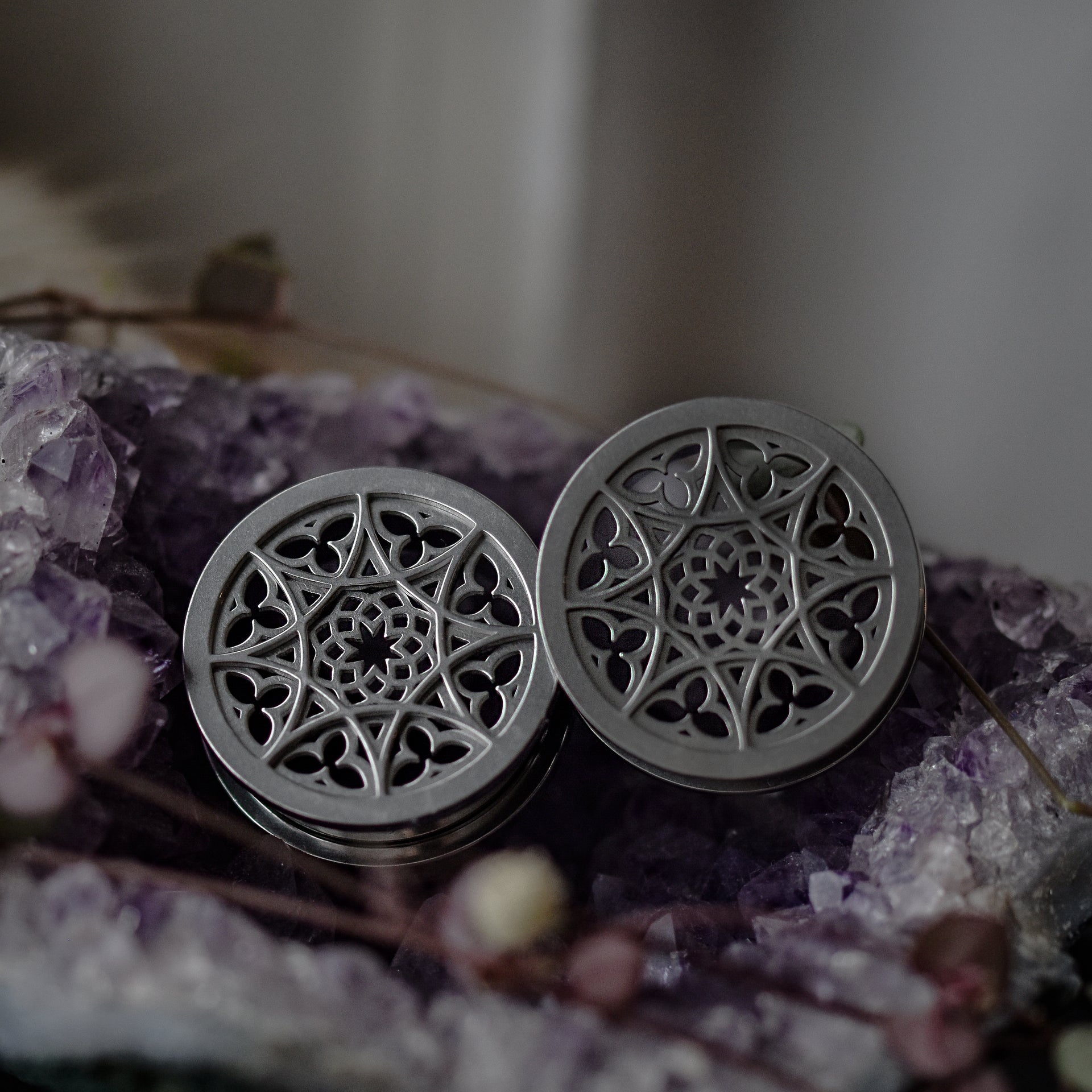 Silberne Kathedralfenster Tunnel für gedehnte Ohrlöcher. Diese Tunnel haben einen bequemen Schraubverschluss auf der Rückseite und ein wunderschönes detailliertes gotisches Rosenfenster auf der Vorderseite. Auch erhältlich in der Farbe Gold.