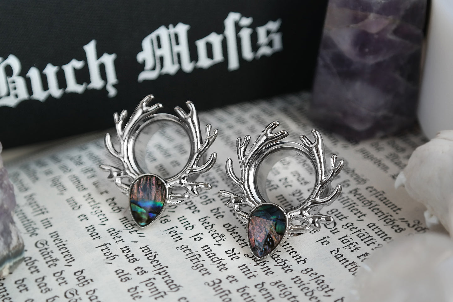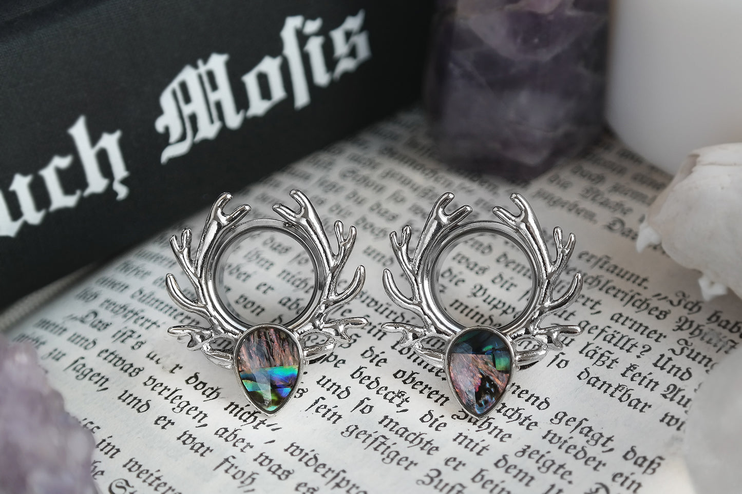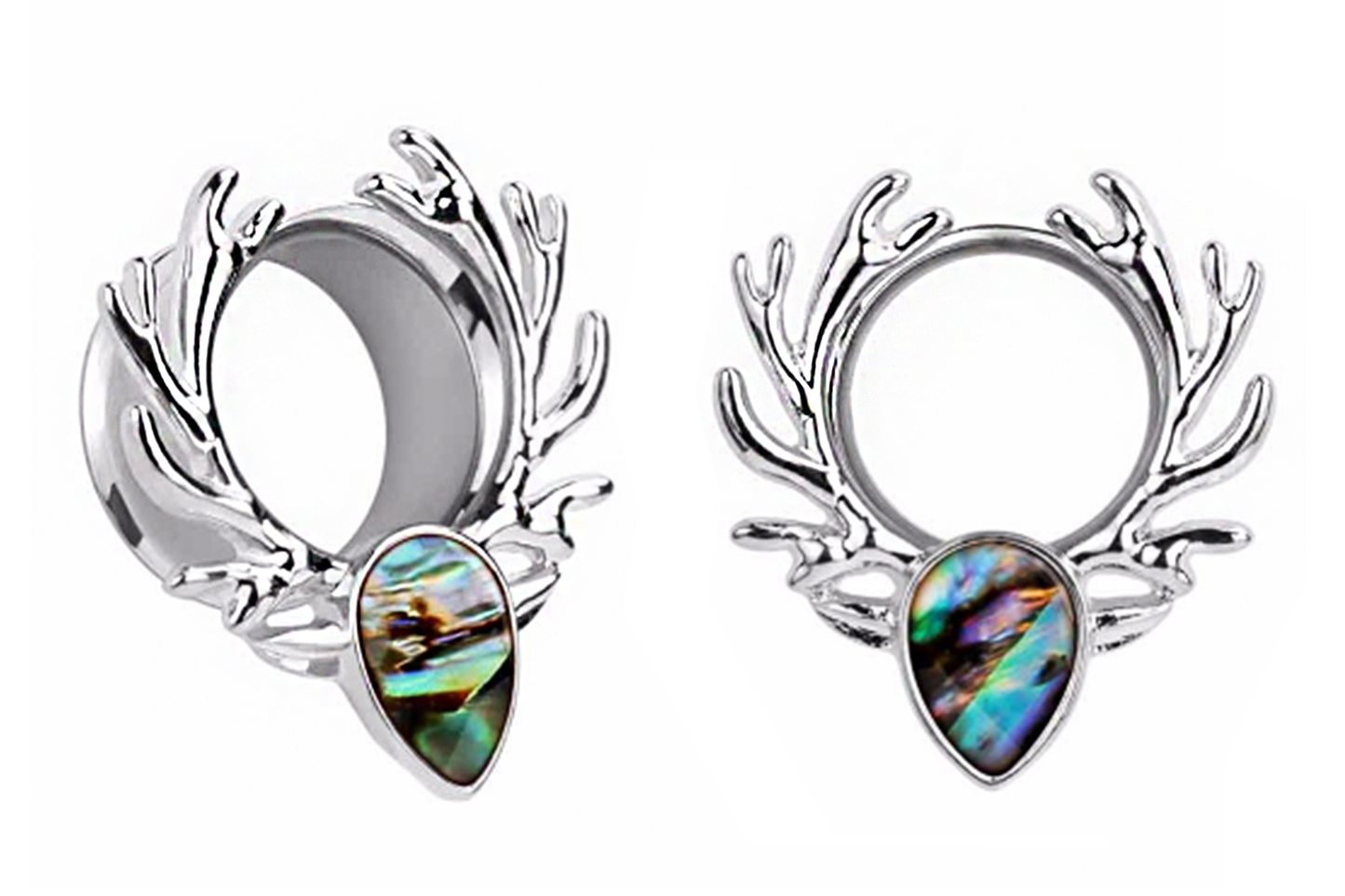 Silver Forest Spirit flesh tunnel for stretched lobes. With beautiful antler design and shiny shell gemstones. Also available in black and rose gold.