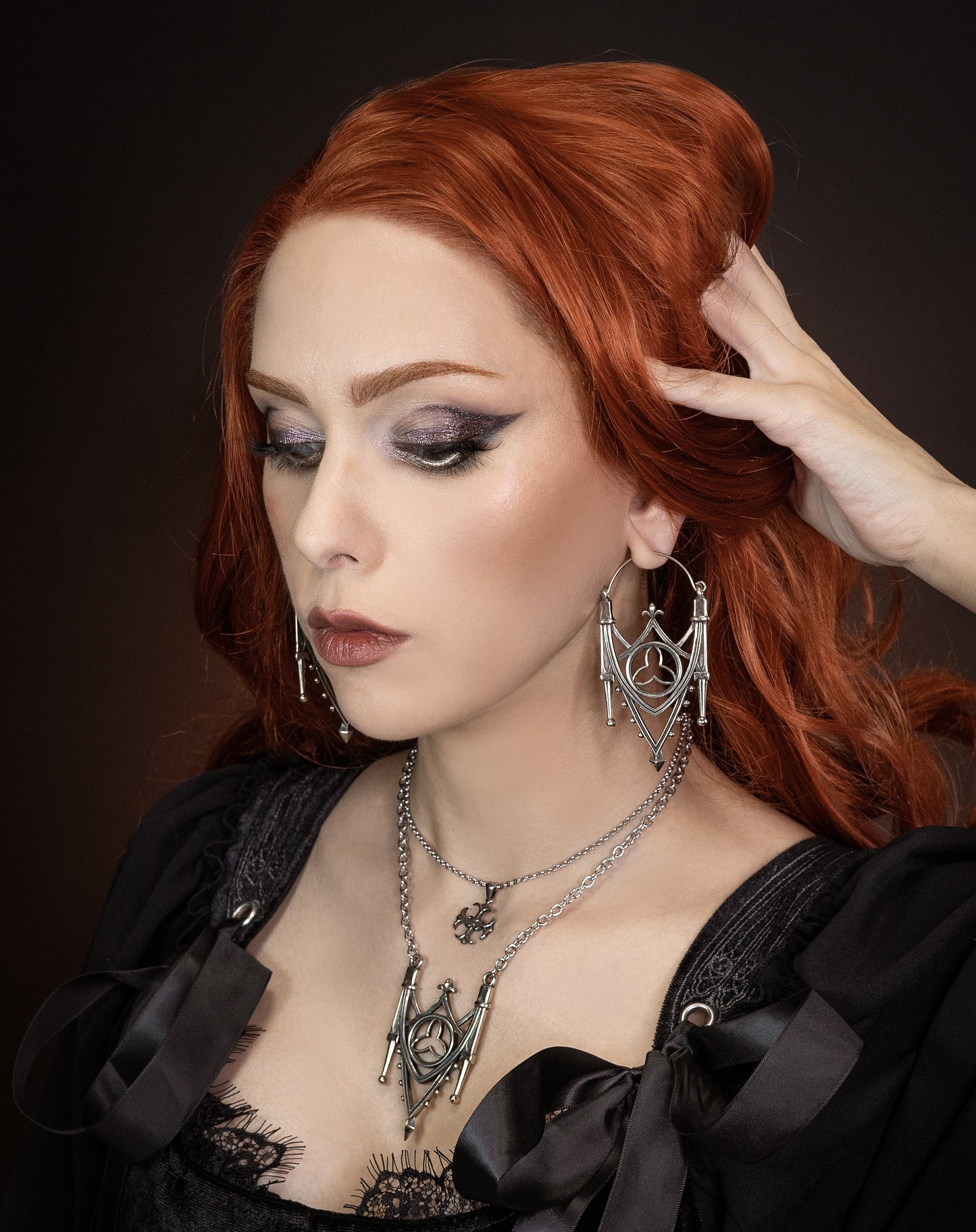 Diese silbernen Gotik Ohrringe zeigen ein detailliertes Giebel Design auf beiden Seiten. Die Hoops sind für normale Ohrlöcher geeignet und können auch durch Tunnel oder Saddle Spreaders getragen werden. Auch erhältlich in der Farbe Gold.