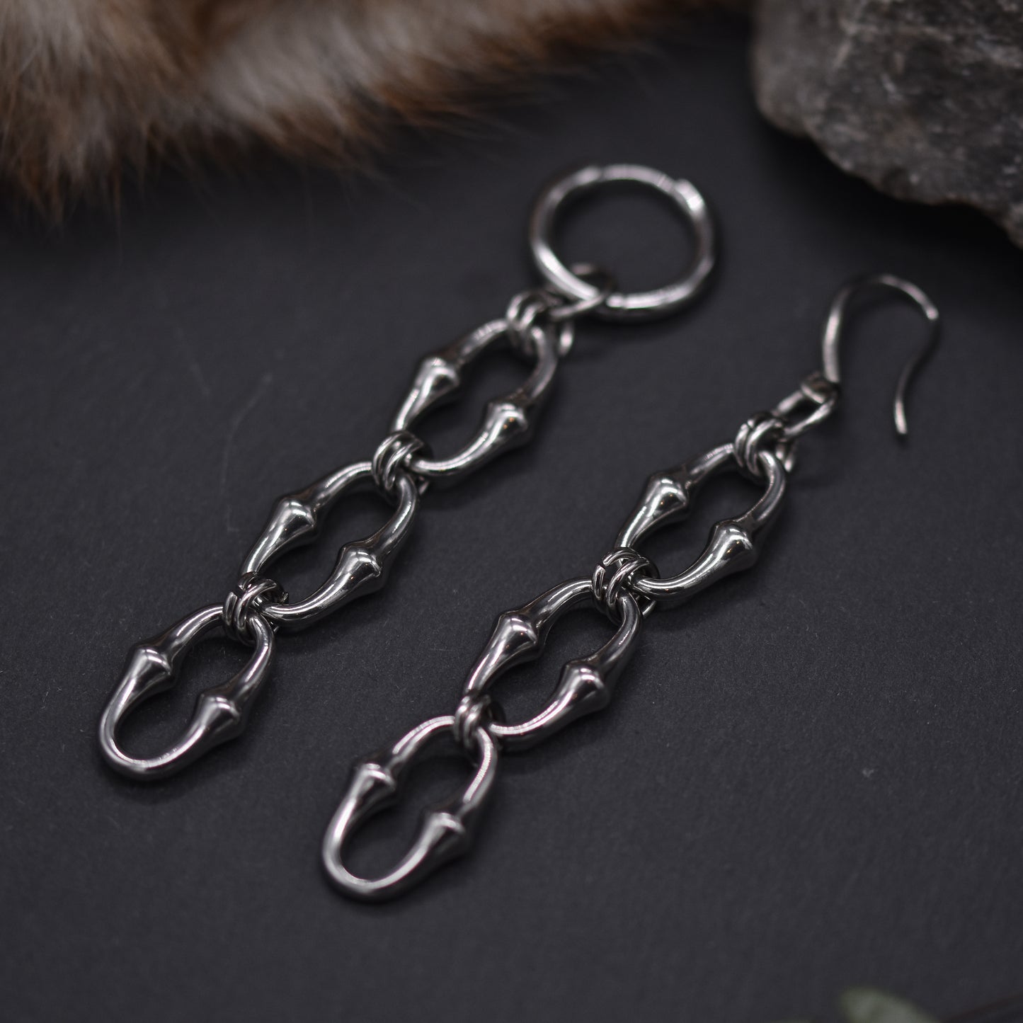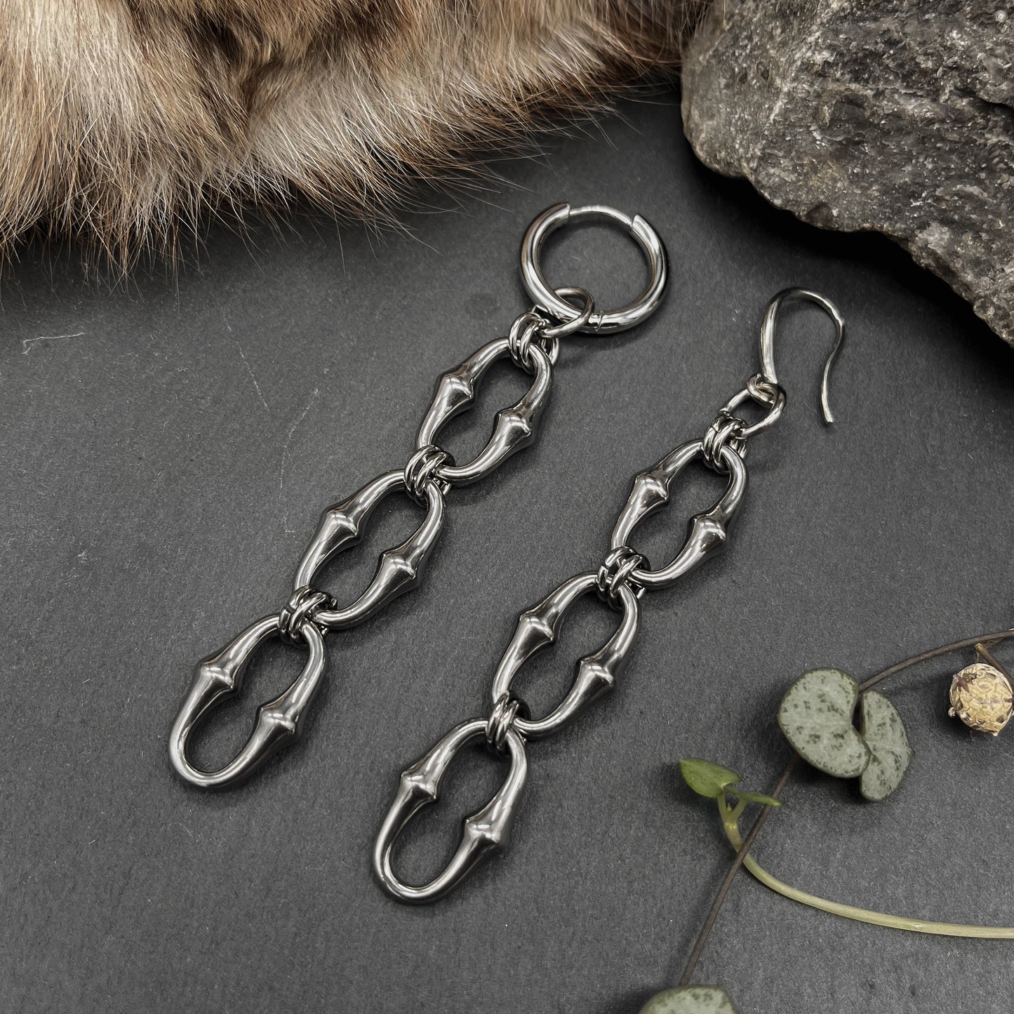 Silberne Gotik Ketten Ohrringe in zwei Varianten. Die Ohrringe passen standard Ohrlöchern und die Creolen Variante kann mit Tunnel oder Saddle Spreader kombiniert werden. Auch erhältlich in der Farbe Gold.