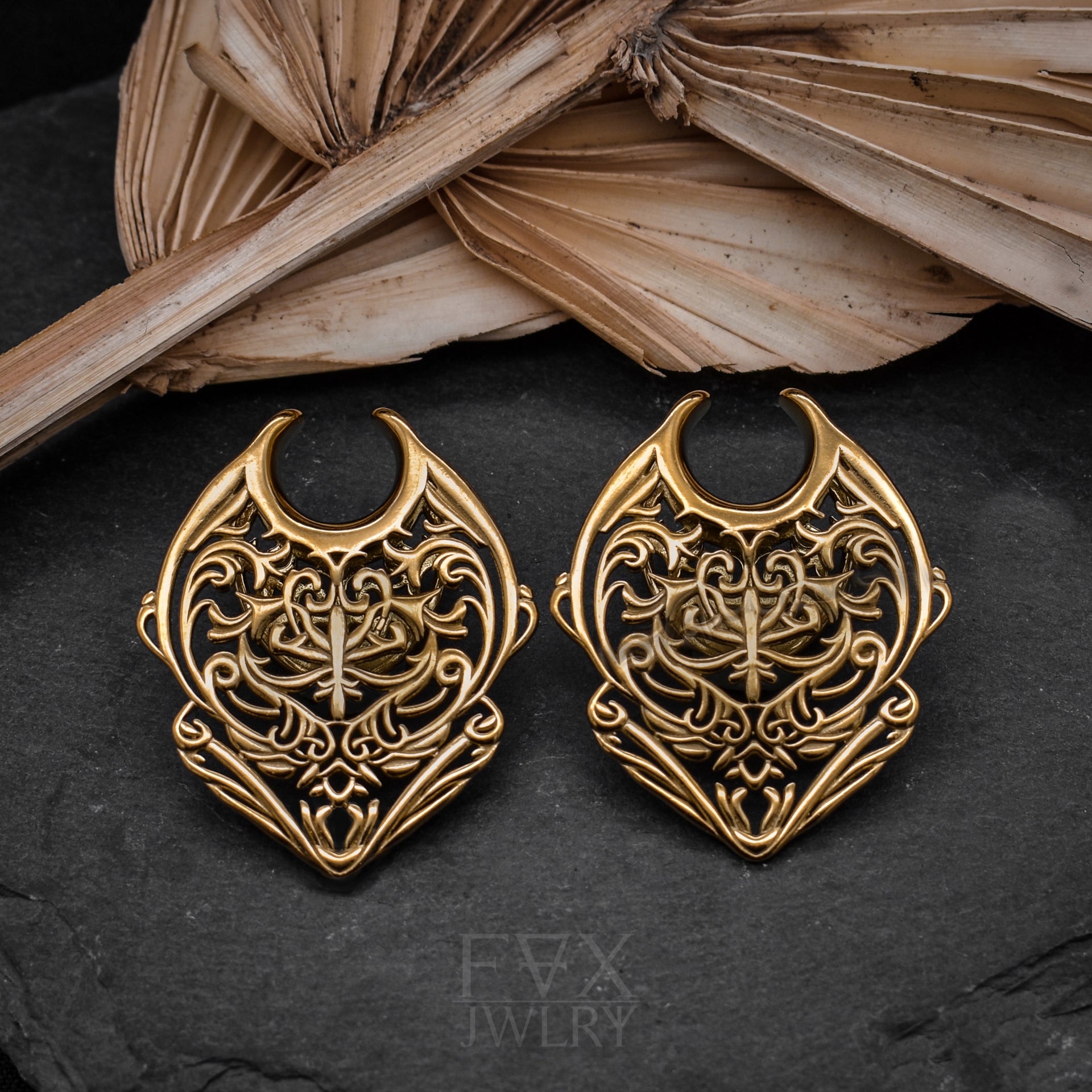 Golden Heart Tribal Saddle Spreaders for stretched ear lobes. Detailed ornaments with heart tribal design. Wearable with size 8 mm | 0g and above.