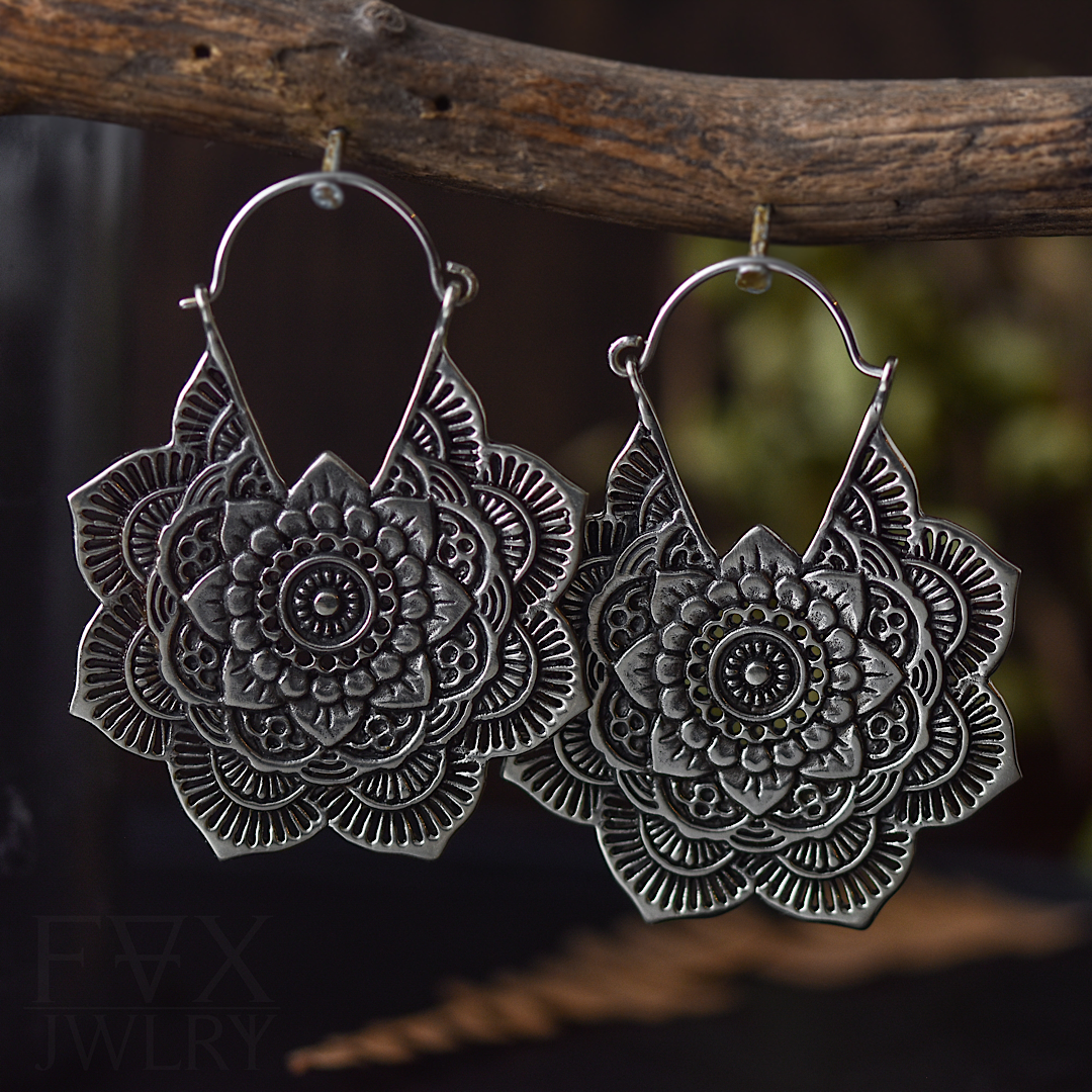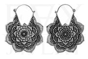 Silver Mandala Flower Earrings, one sided detailed flower design. These hoops are also wearable perfect through tunnels and saddle spreaders. Also available in gold.