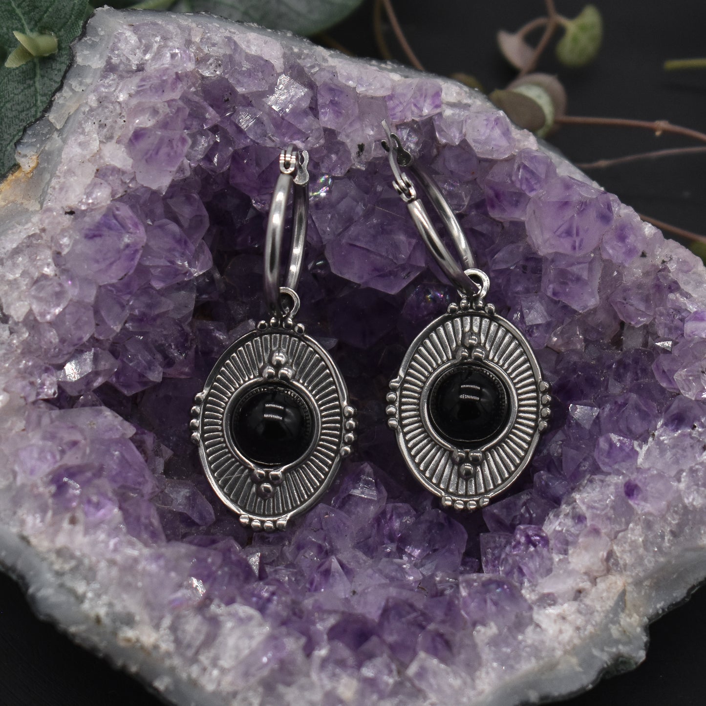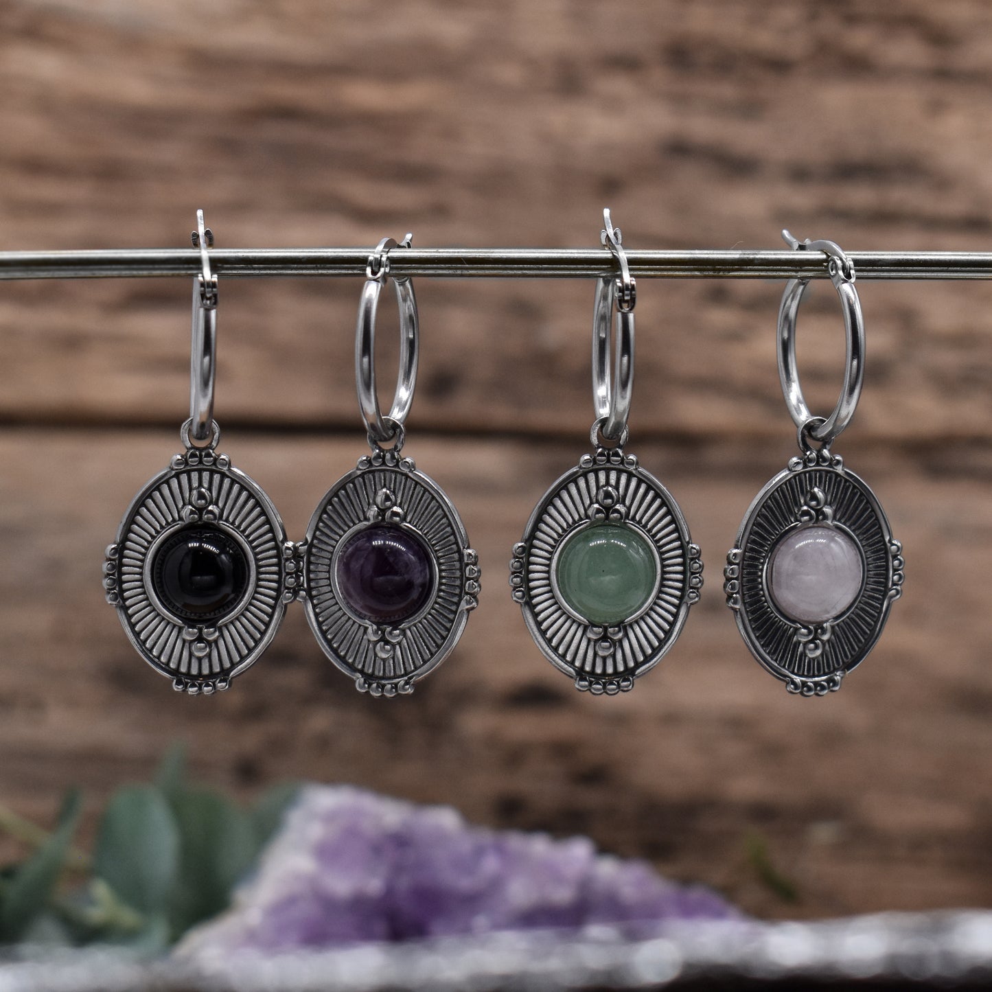 Add some mystique to your look with these Silver Mystic Earrings. Made of stainless steel, these earrings come in a variety of gemstone options like amethyst, Green Aventurine, Rose Quartz and Black Agate. The huggie earrings fit standard pierced ears and are also wearable through flesh tunnels or saddle spreaders.