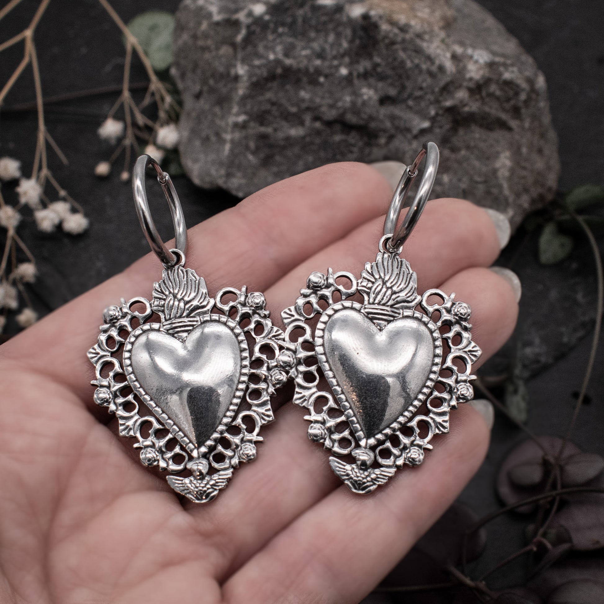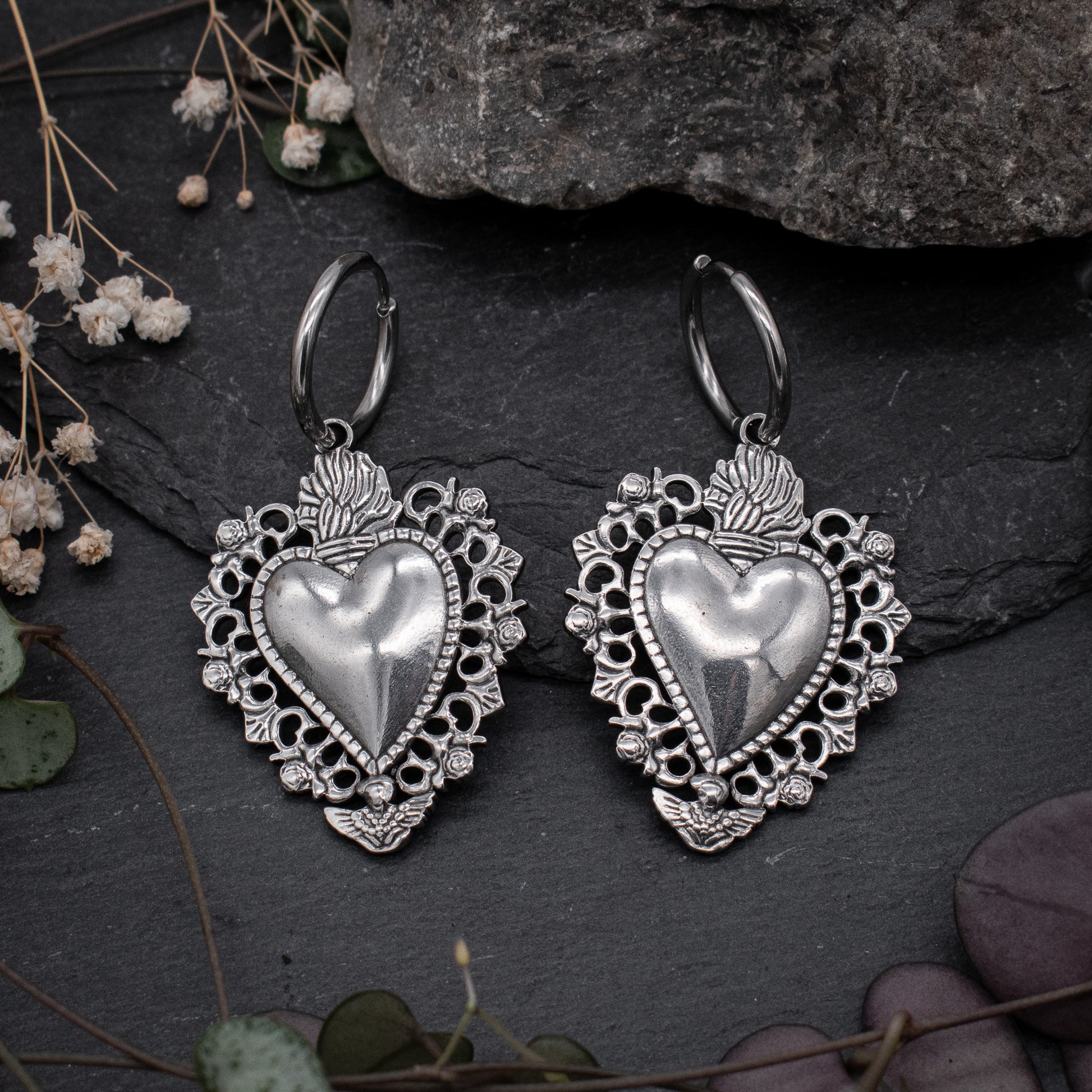 Heilige Symbolik trifft auf modernen Stil: Diese Silbernen Sacred Heart Creolen vereinen verzierte Herzanhänger mit robusten Creolen aus hochwertigem 304-Edelstahl. Vollständig aus hypoallergenem Edelstahl gefertigt, sind sie besonders langlebig und hautfreundlich. Die Ohrringe lassen sich sowohl in normalen Ohrlöchern als auch durch Tunnel oder Saddle Spreader tragen. Auch in Gold erhältlich.