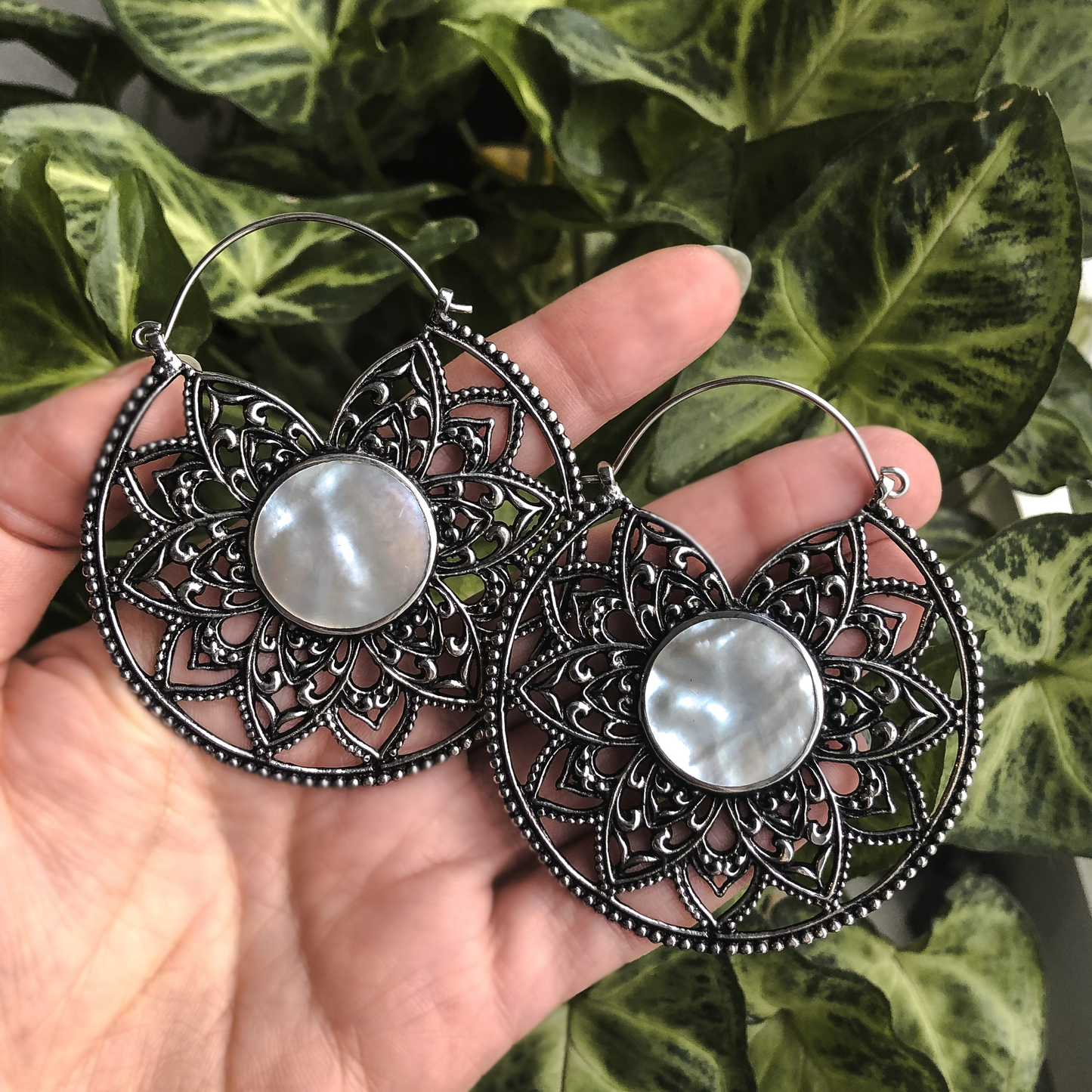 Beautiful large hoops, one sided mandala design with shimmery white mother of pearl inlays. These earrings are also wearable perfect through tunnels and saddle spreaders. Also available in gold.