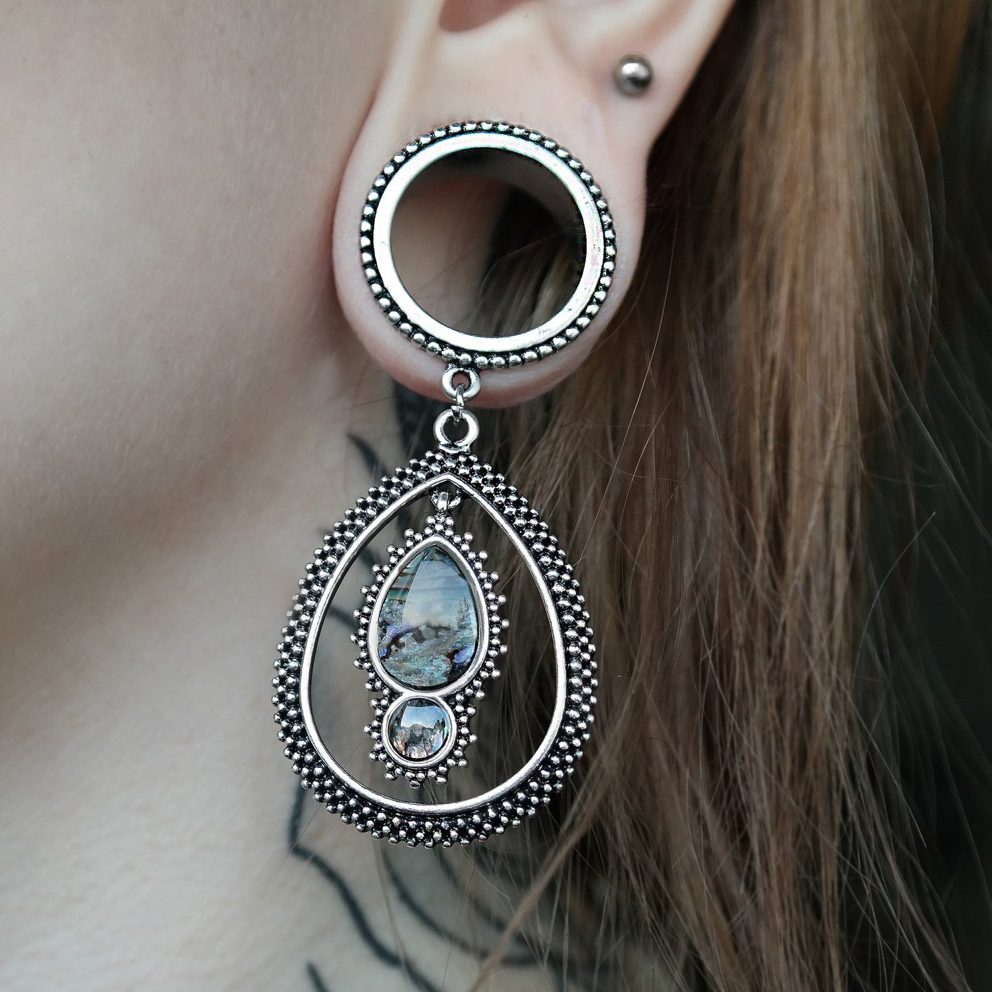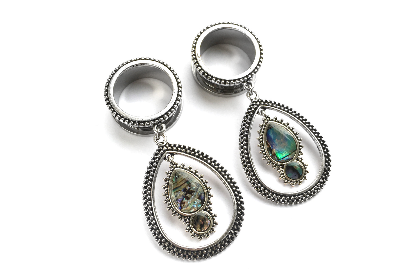 Silver steel tunnel with beaded frame and teardrop pendants with shell charms.