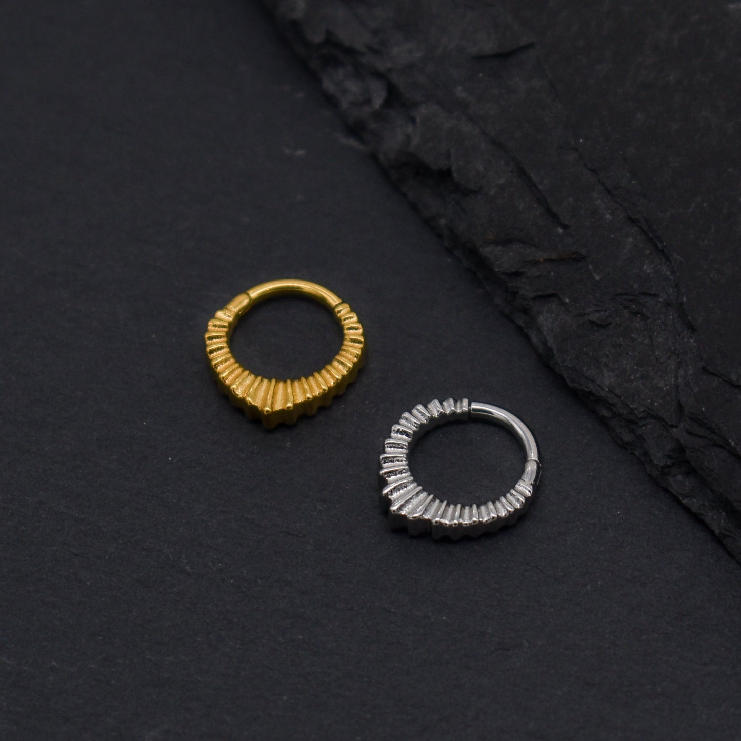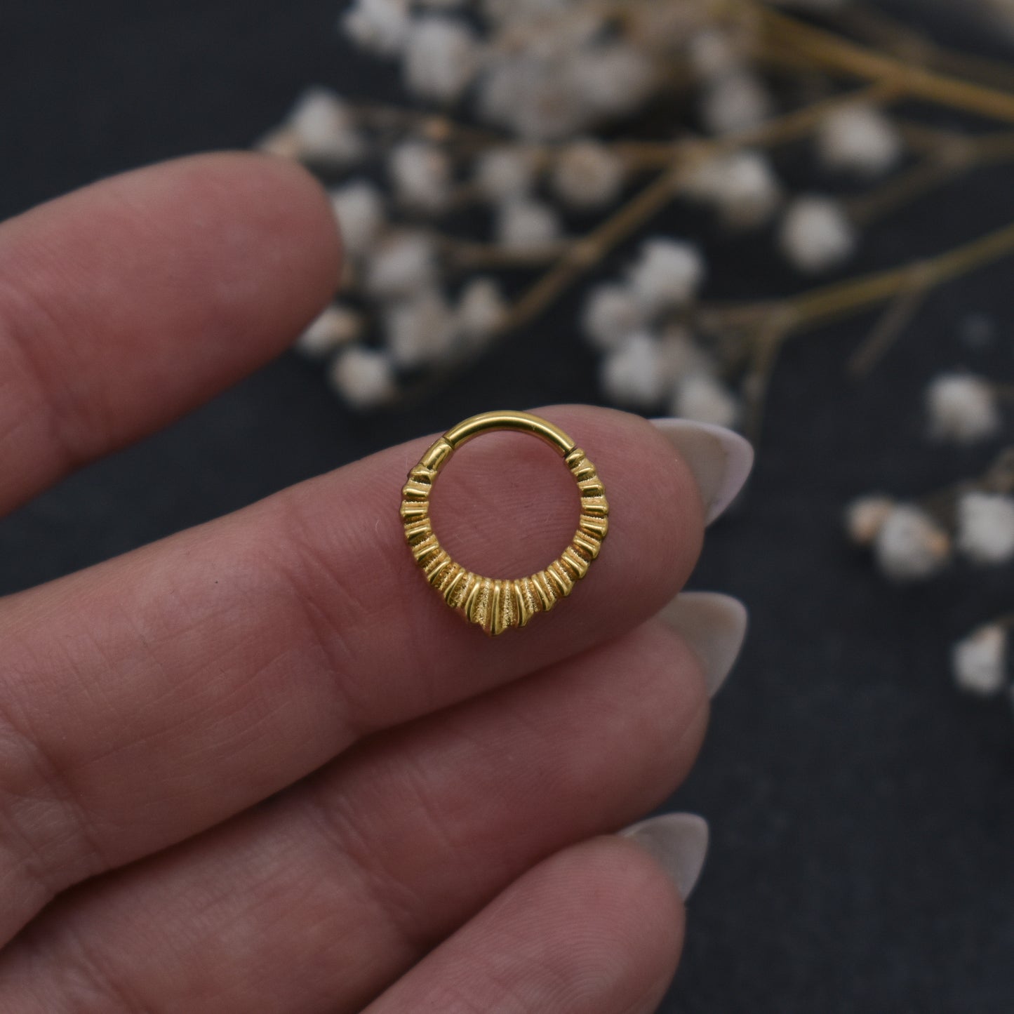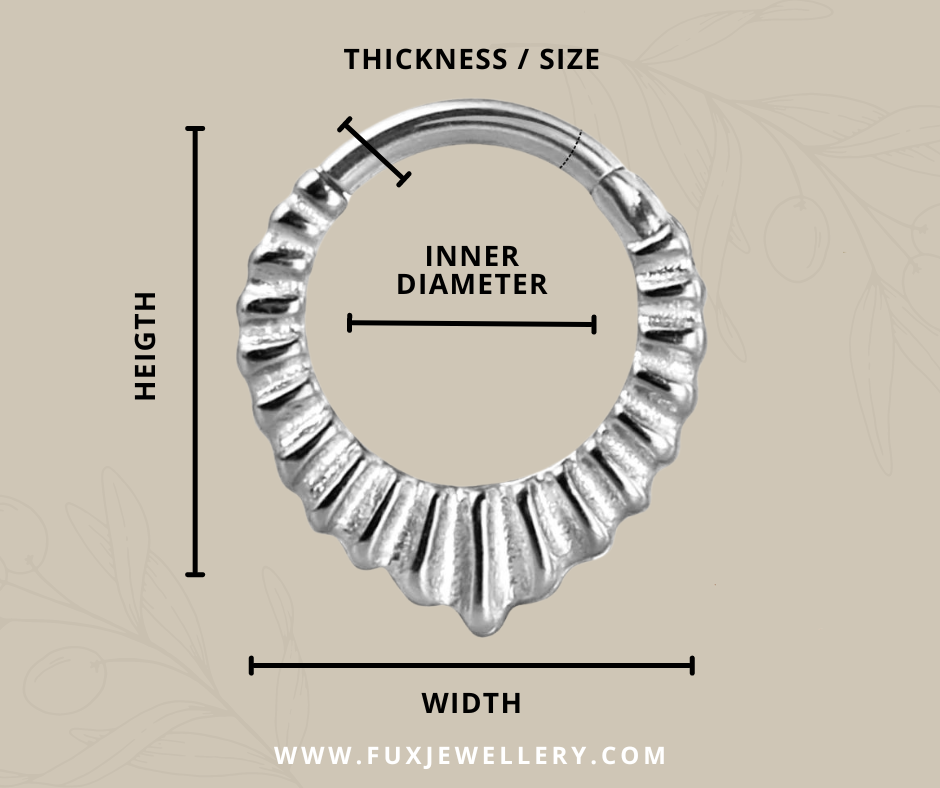 Beautiful aura style ring clicker. Perfect to stack with other piercings from the shop. Easy clicker fastener to open and close. Wearable in septum, helix, daith, lobes or anywhere else it's suitable.