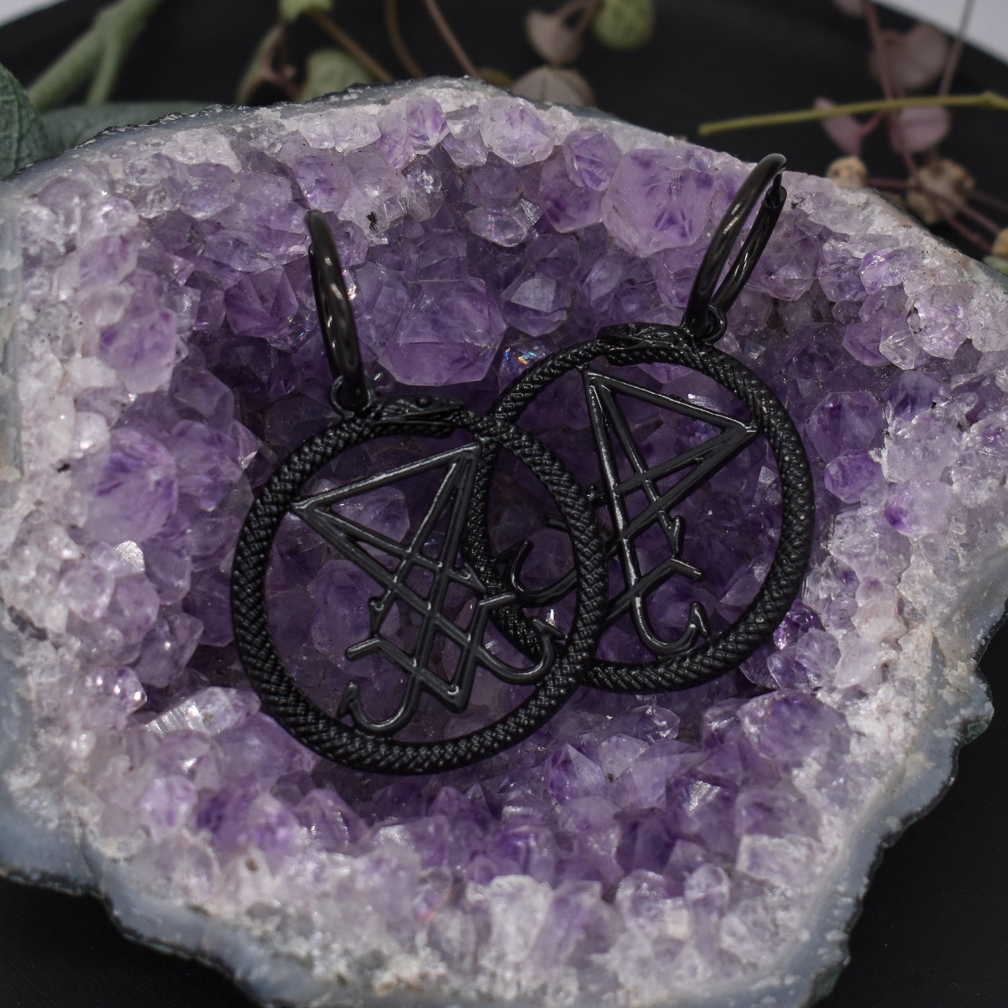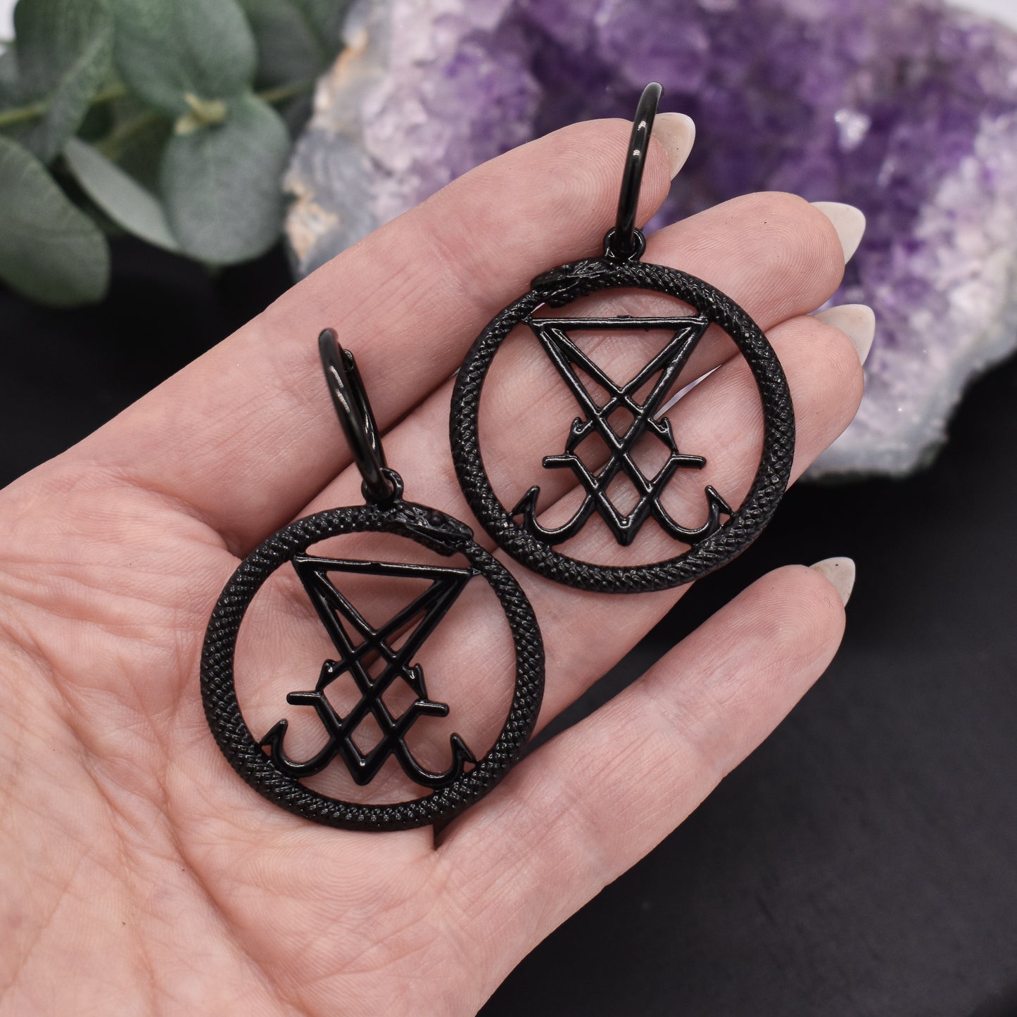 Black Sigil of Lucifer Ouroboros combined with high quality 304 stainless steel earring hoops or hooks. For standard pierced ears and wearable through tunnels. Also available in silver.