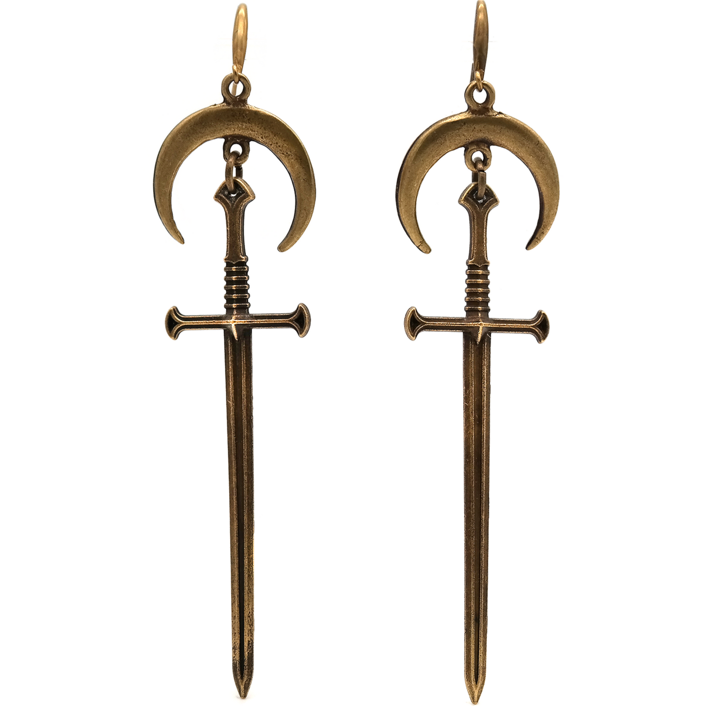 Bronze Moon and Sword Earrings. Bronze swords hanging on crescent moon charms, combined with bronze earring hooks. Handmade with love and care.
