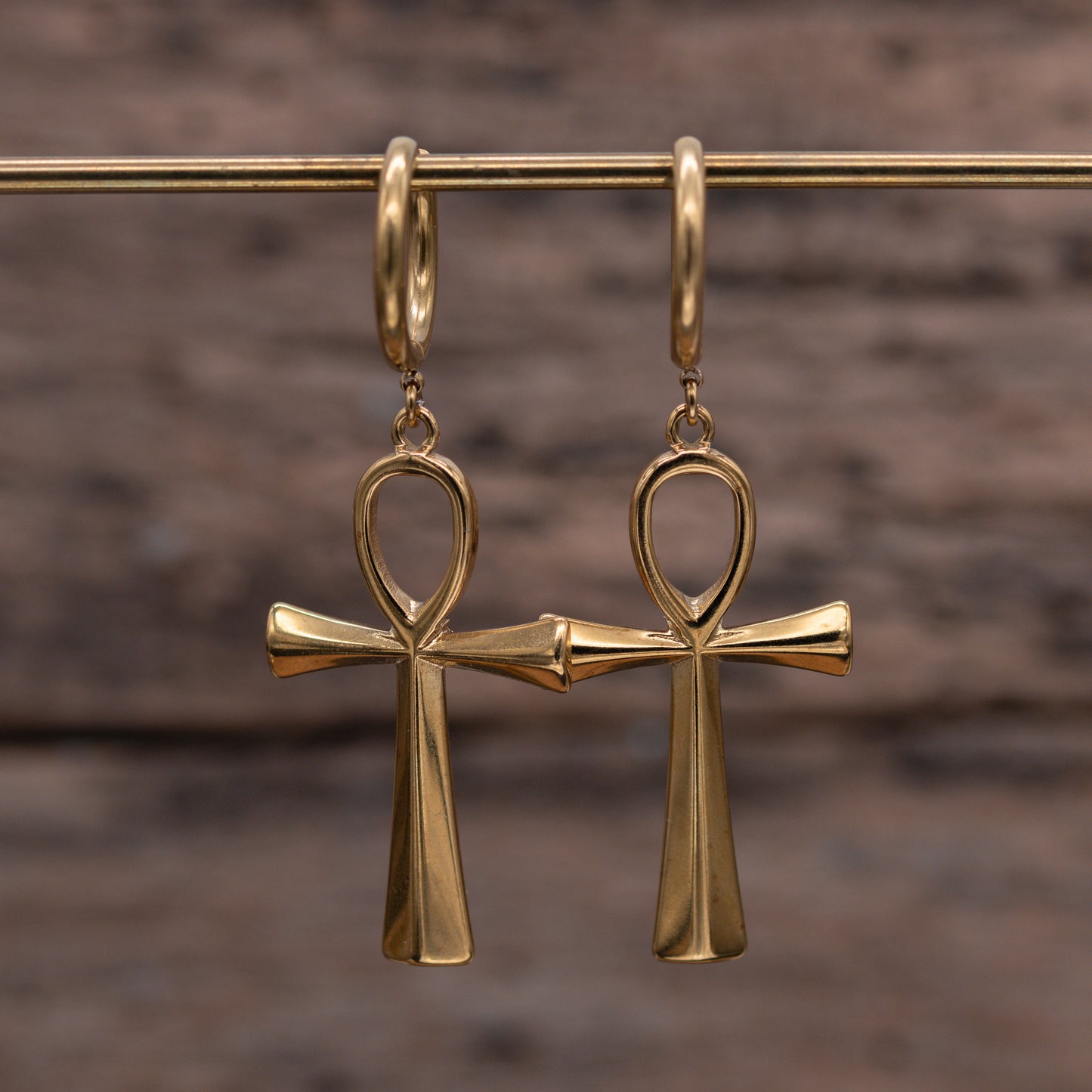 Golden Ankh earrings made of high-quality stainless steel. These earrings fit standard pierced ears and are also wearable through flesh tunnels or saddle spreaders. Also available in silver color.