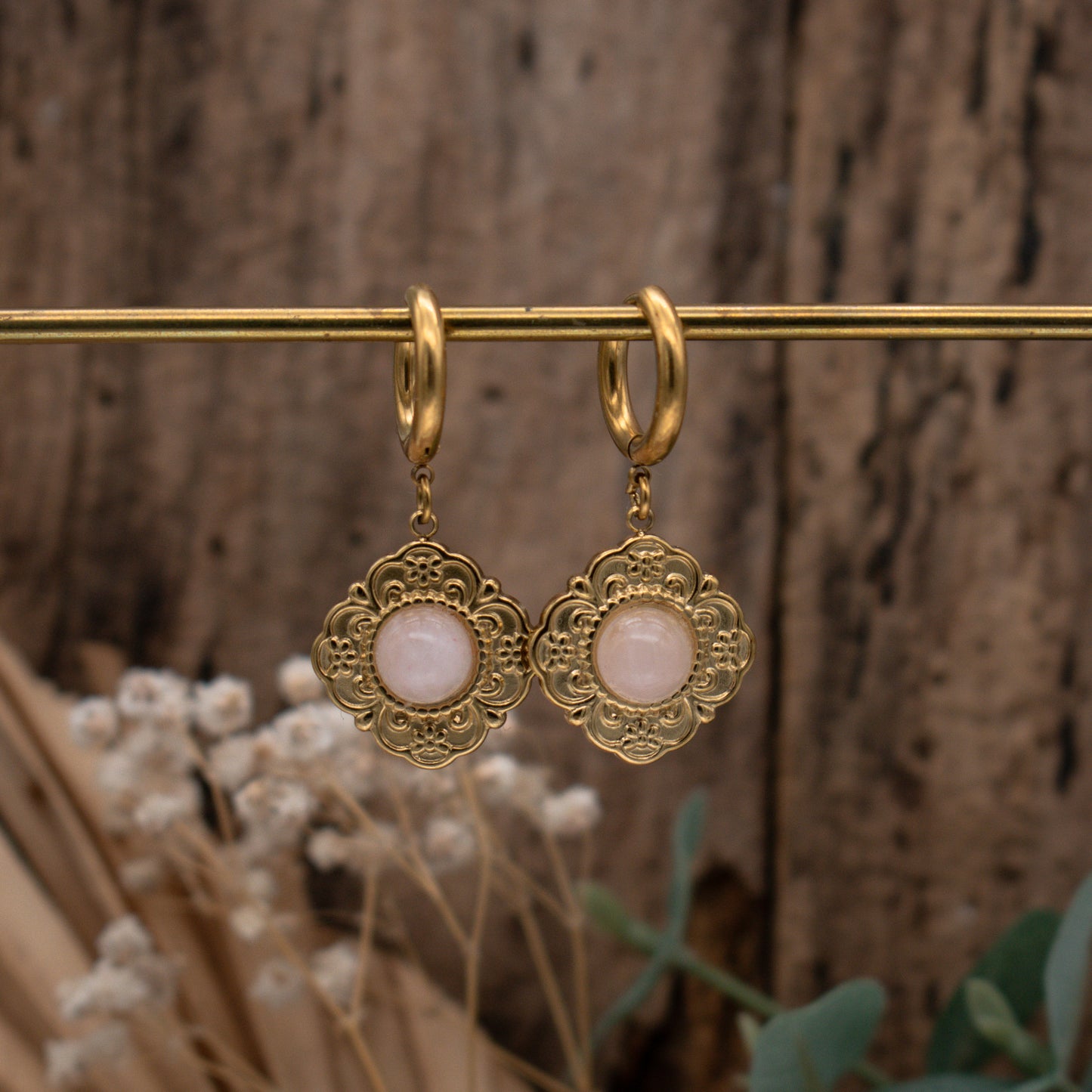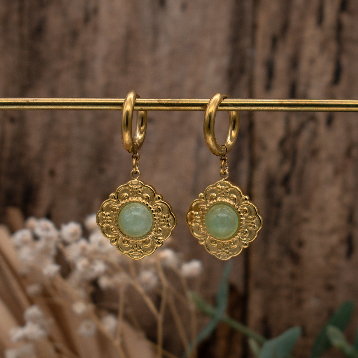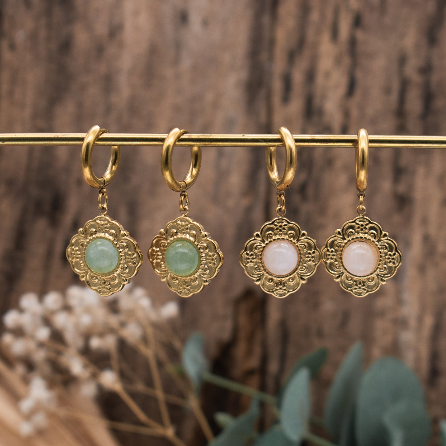 The Golden Baroque Floral Earrings made of high quality stainless steel and they come in various gemstone options like rose quartz and green aventurine. The huggie earrings fit standard pierced ears and are also wearable through flesh tunnels or saddle spreaders.