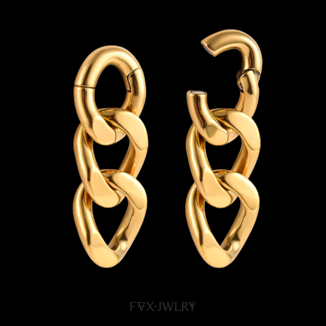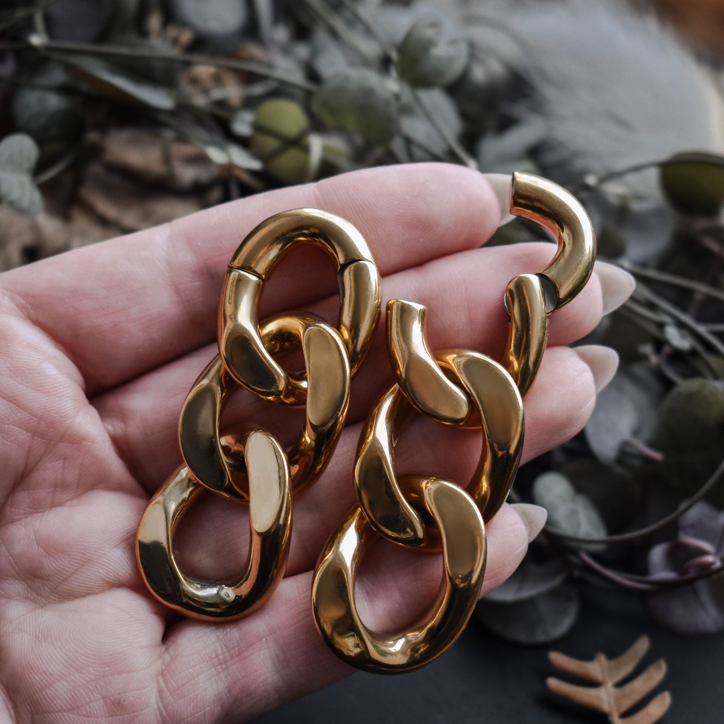 Golden Chain Ear Weights for stretched lobes. Chunky chains combined with a magnetic chain clicker ring. These hangers can fit stretched ears starting at least 6 mm | 2g. This is the minimum required size to wear, you can wear it with all sizes above. Also available in silver.