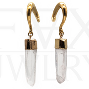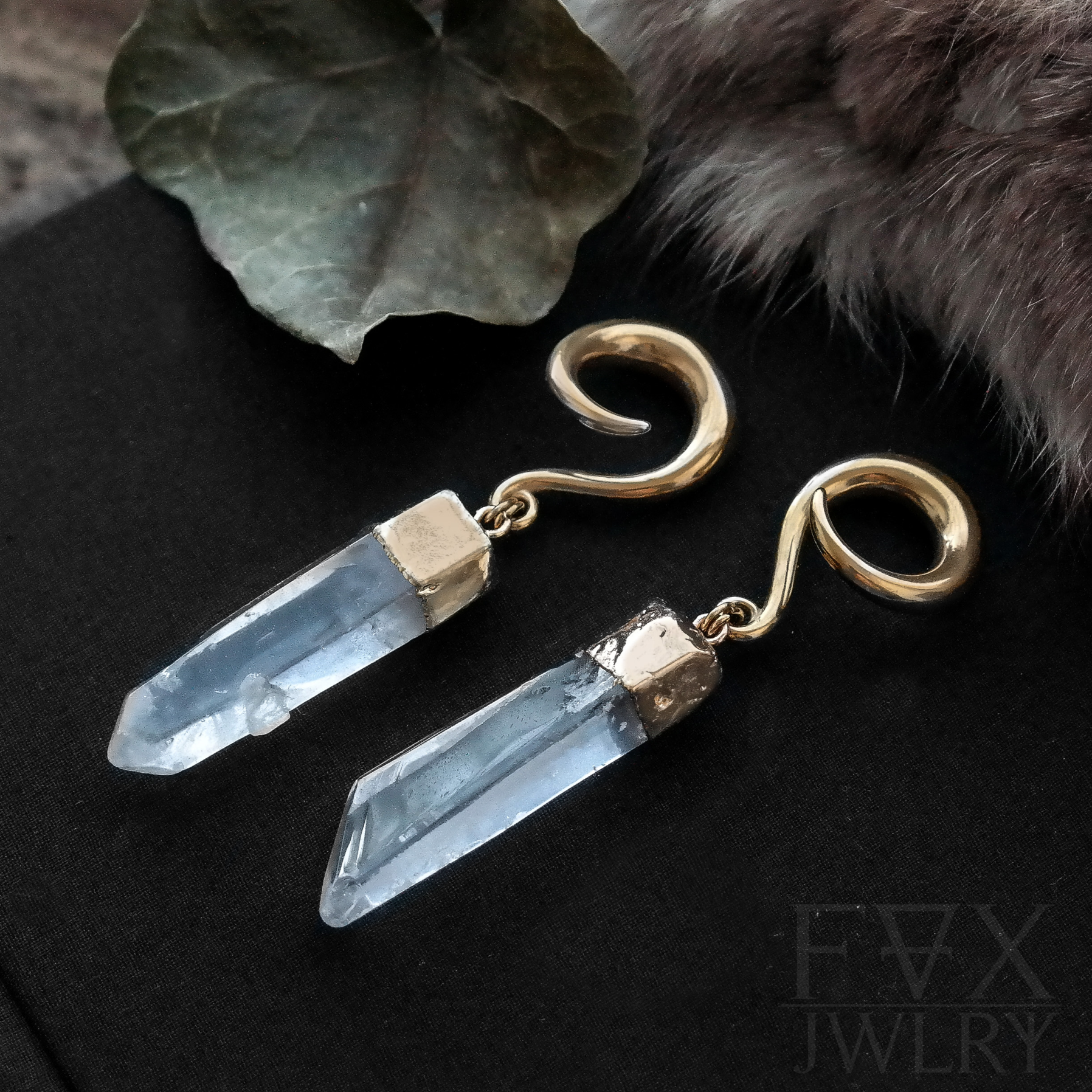Golden Quartz Crystal Ear Weights for stretched lobes. With dangling quartz pendants. Handmade with love and care. These ear weights can fit stretched ears starting at least 6 mm | 2g and above.