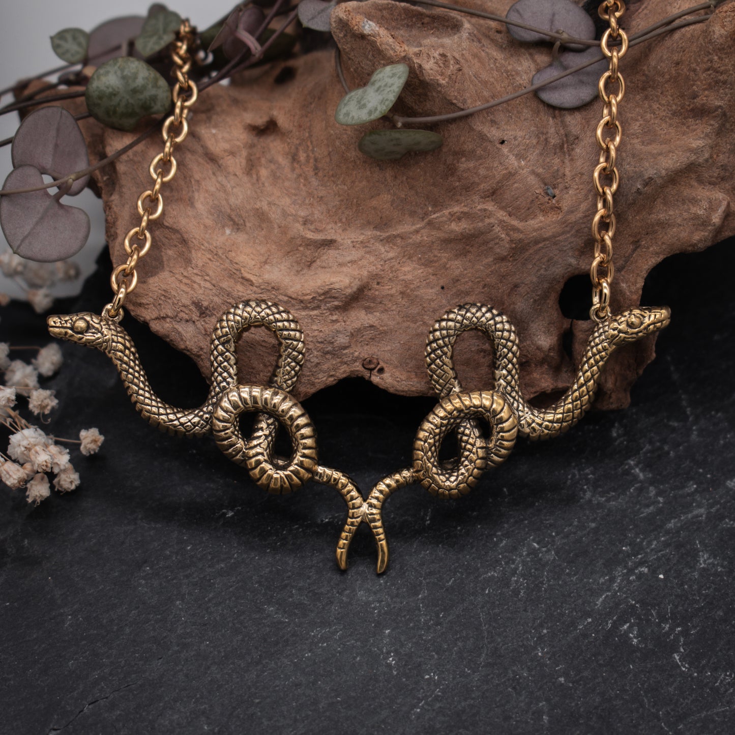 This Golden Double Snake Necklace features two elegant snakes, creating a flattering and eye-catching shape. Made with high-quality stainless steel chains and brass, this necklace adds a touch of sophistication and charm to any outfit. Also available in silver.