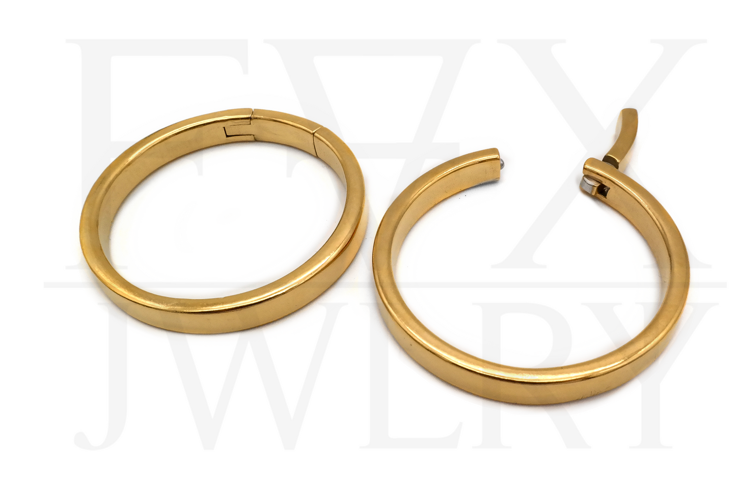 Golden Flat Clicker Ear Weights for stretched lobes with clicker closure. These hangers can fit stretched ears starting at least 5 mm | 4 g and above. Also available in silver.