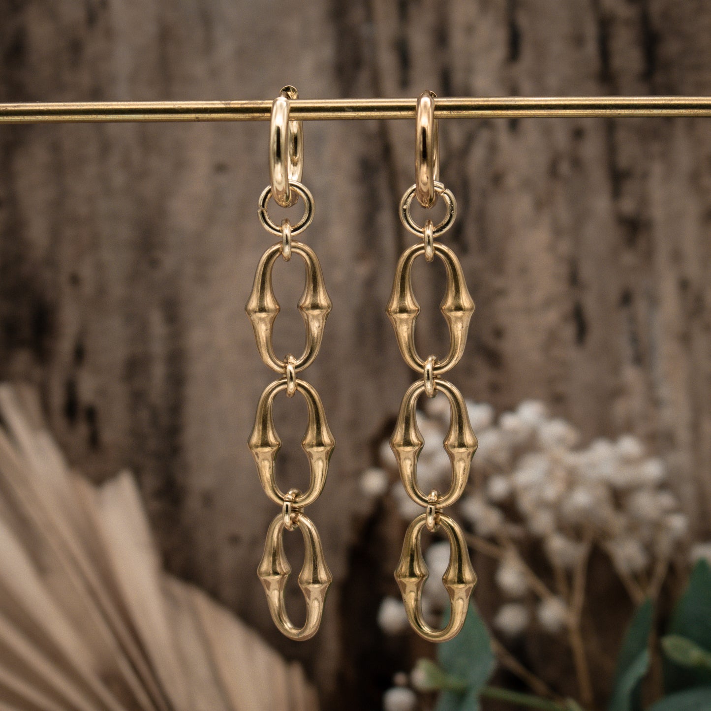 Golden Gotik Chain Earrings with two earring options. They fit standard pierced ears, and the hoop option is also wearable through flesh tunnels or saddle spreaders. Also available in silver.