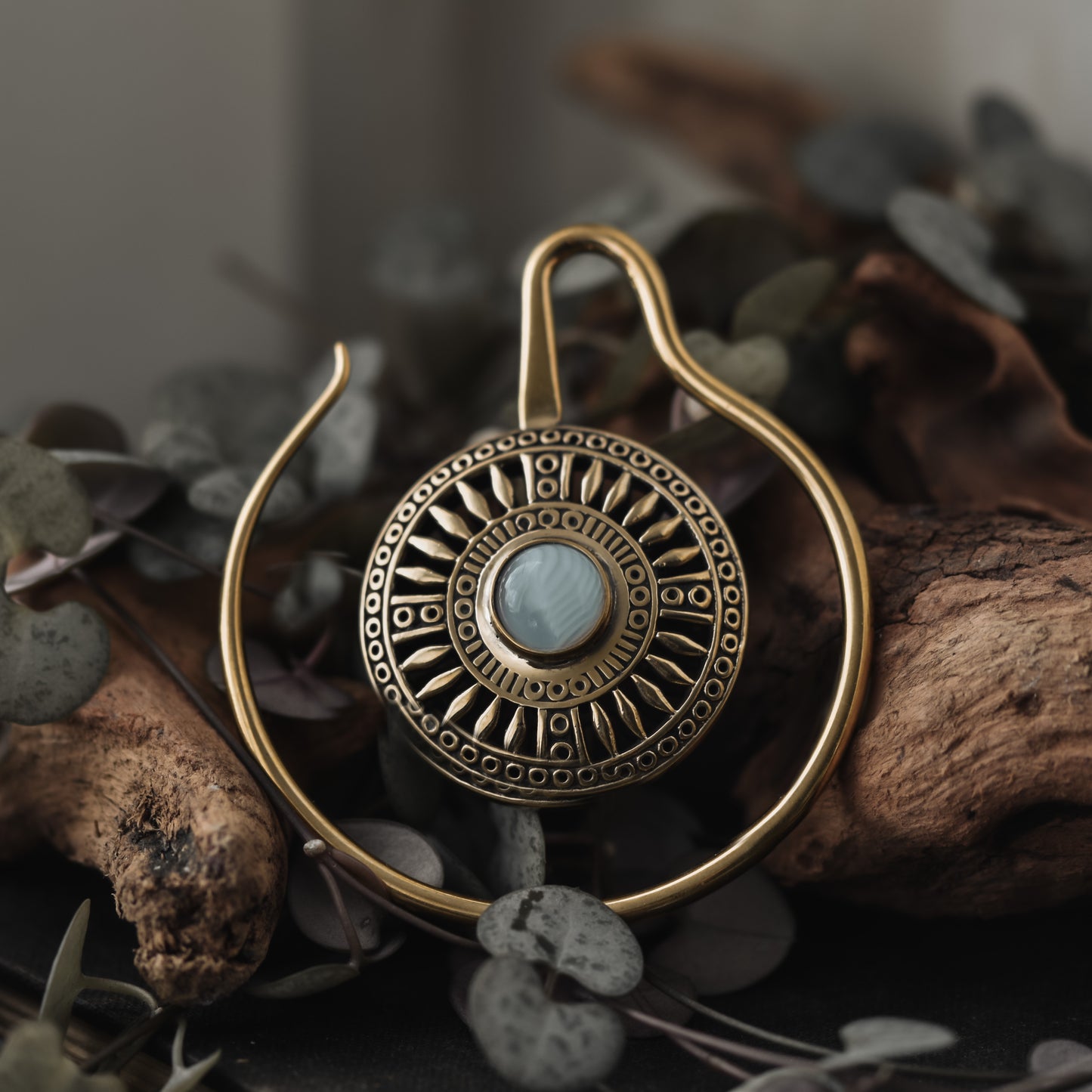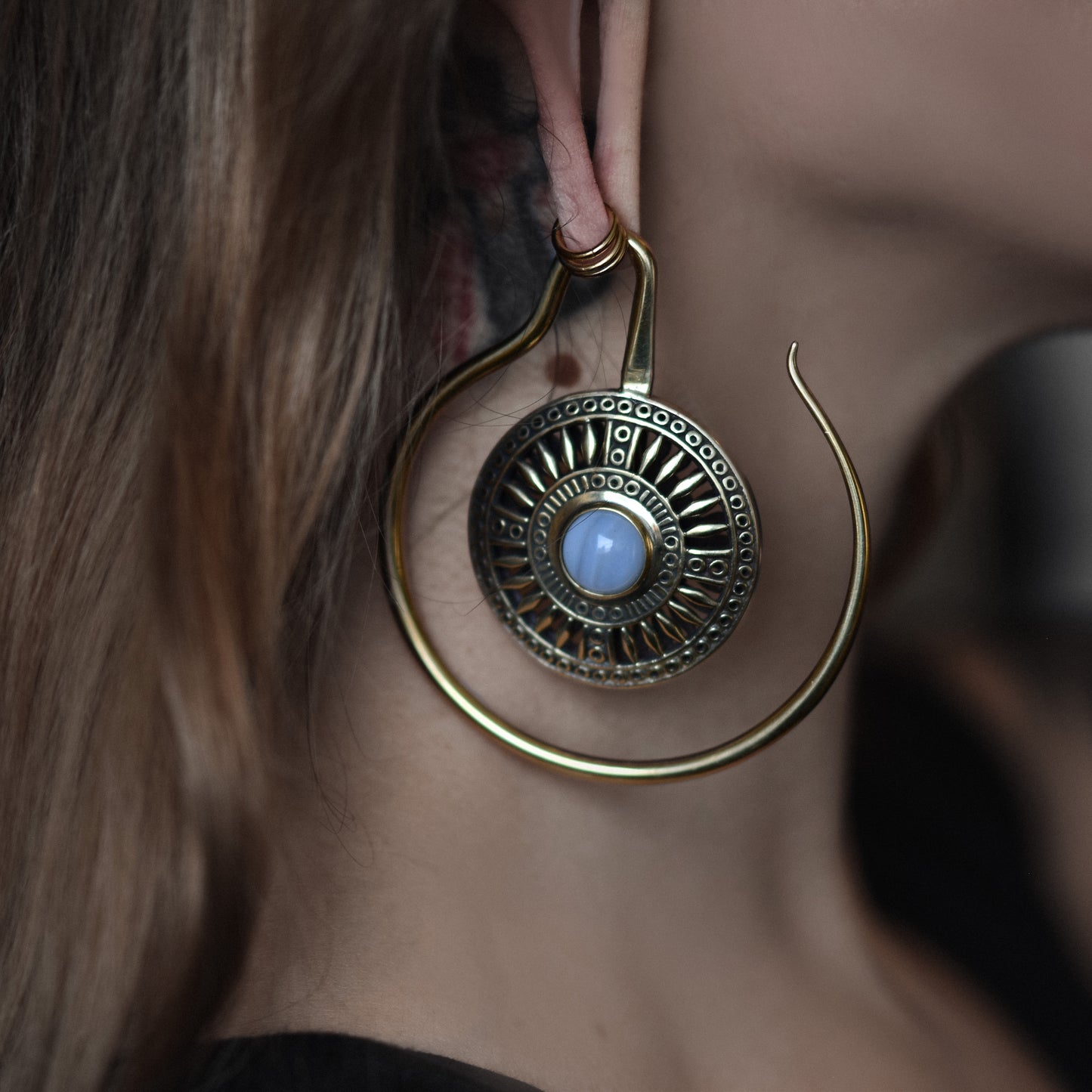 Golden Holda Ear Hangers with botswana agate gemstones. Stunning detailed double sided design. These ear hangers can fit stretched ears starting at least 3 mm | 8 g and above.