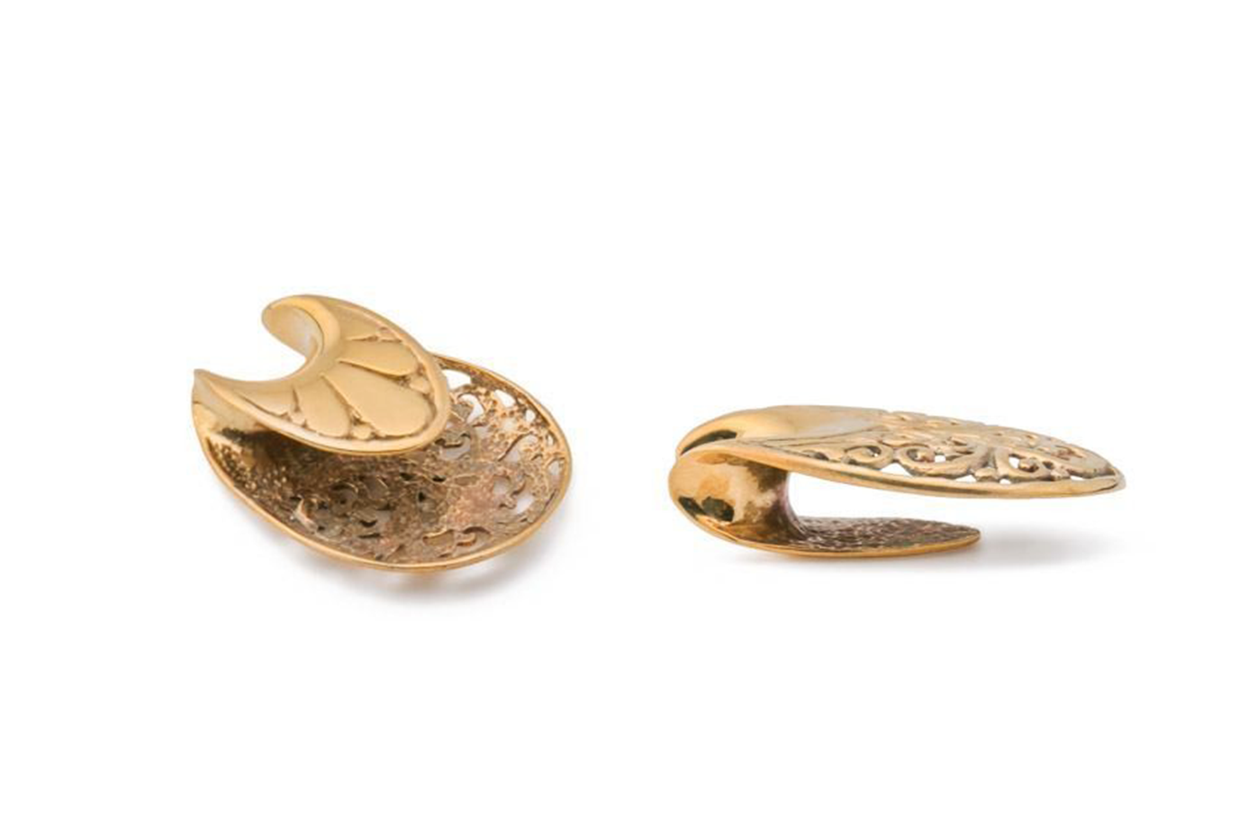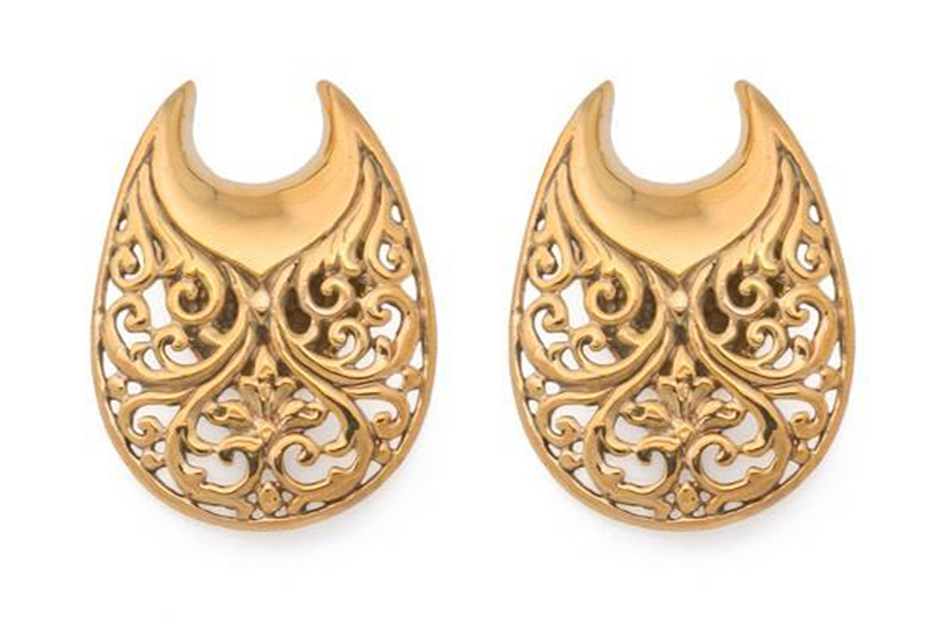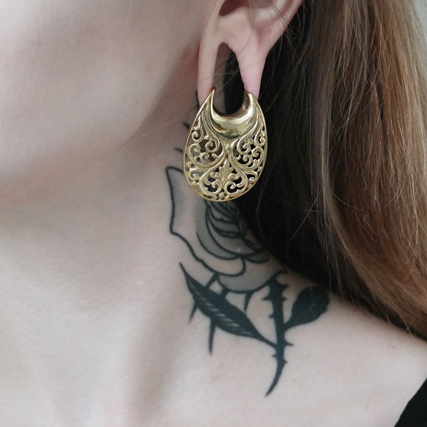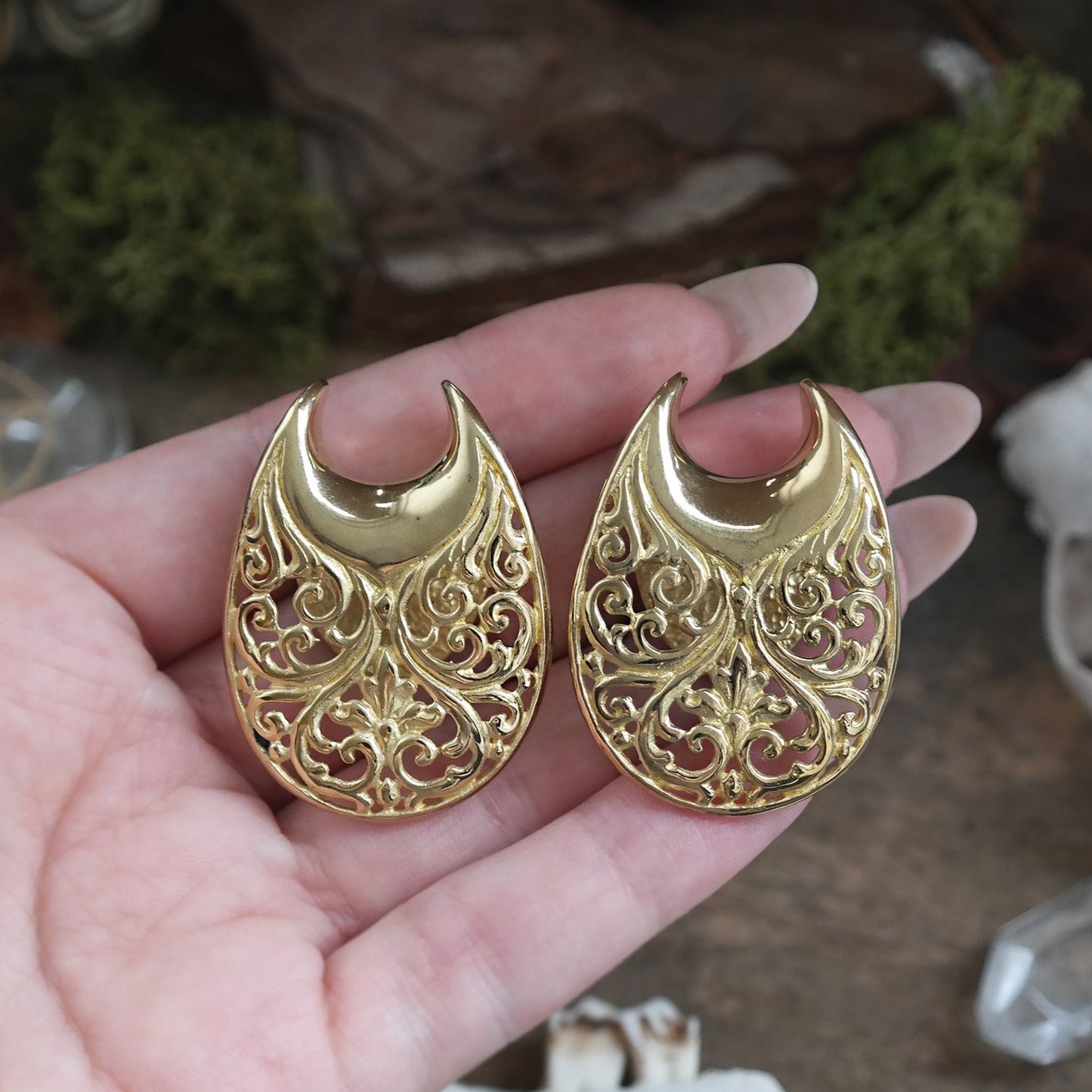 Beautiful detailed golden brass hangers. The back of the hangers feature a 19mm wide saddle that goes through the lobe. These hangers are able to fit stretched ears starting at least 14 mm | 9/16" and above.