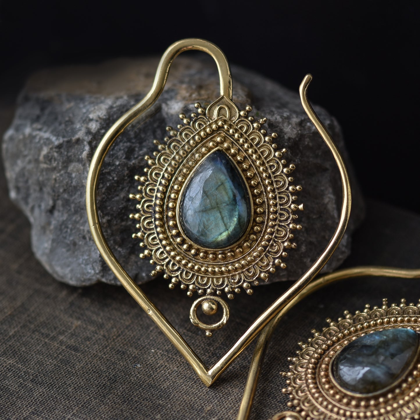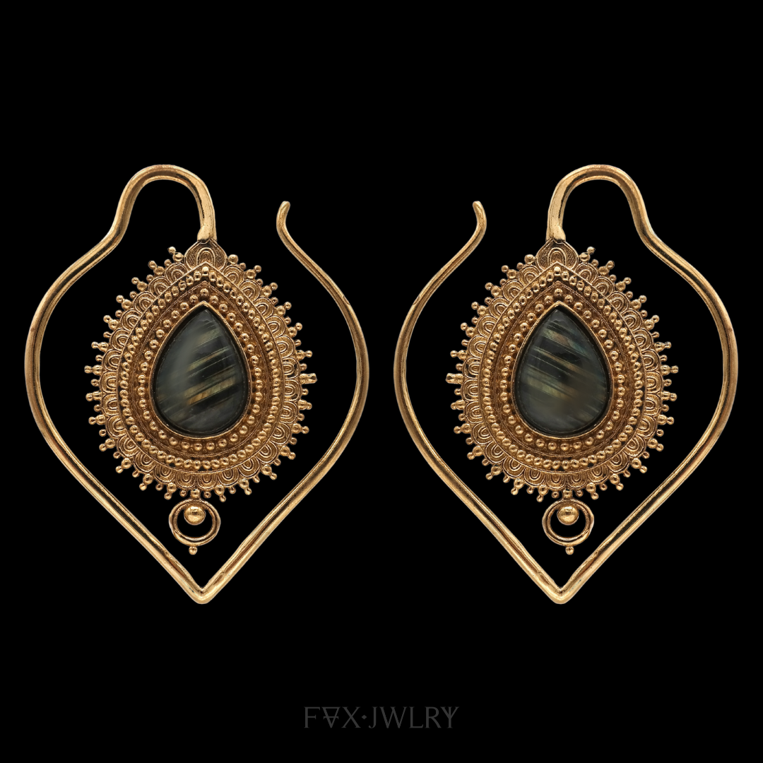 Detailed golden Ear Hangers with teardrop shaped labradorite gemstones on both sides.