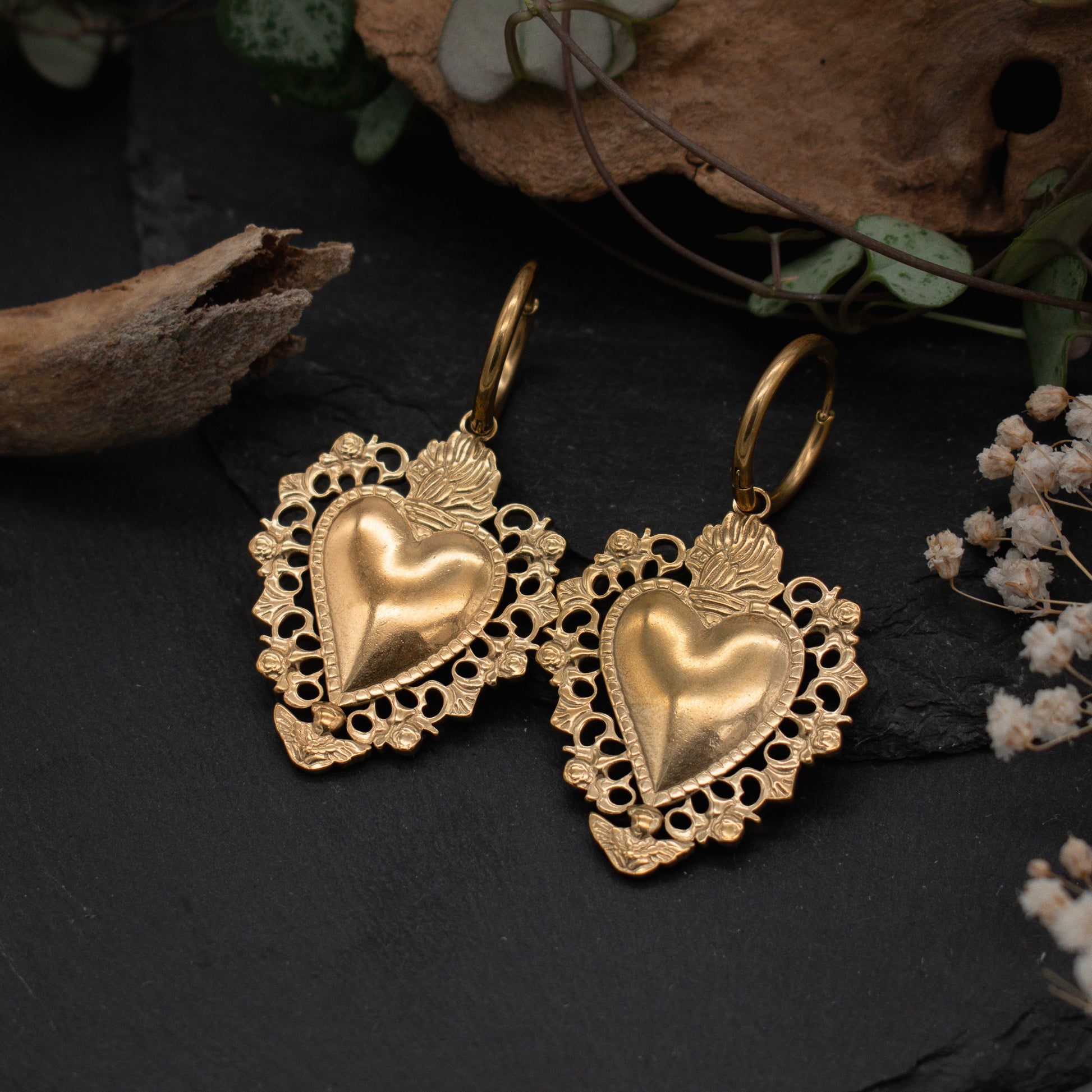 These Golden Sacred Heart Hoops combine sacred symbolism with a modern edge. Featuring graceful heart charms suspended from robust 304 stainless steel hoops, these earrings are built entirely from hypoallergenic stainless steel for lasting durability. These earrings can be worn with standard piercings, as well as through tunnels or saddle spreaders. Also available in silver.
