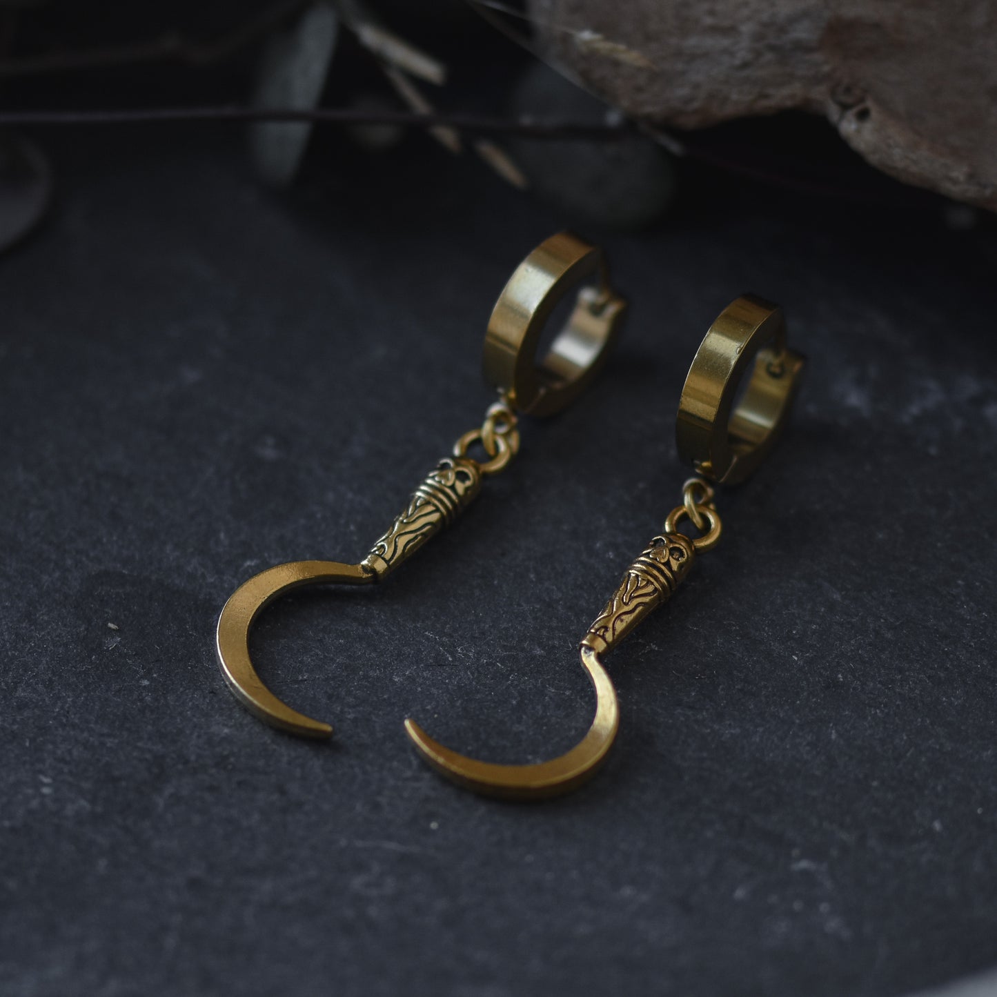 Detailed silver sickle charms hanging on high quality stainless steel huggie hoops. Also available in gold.