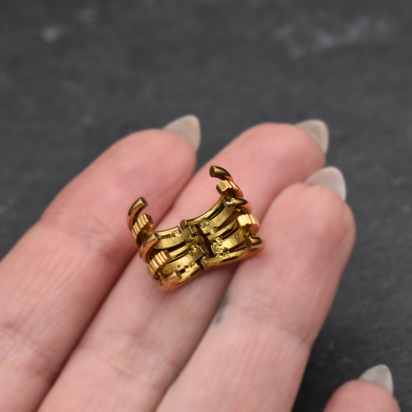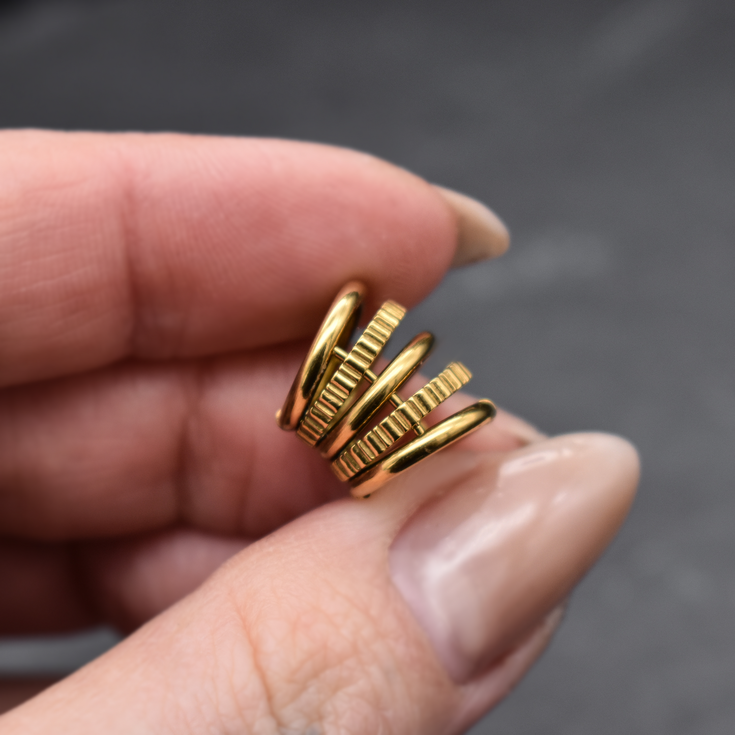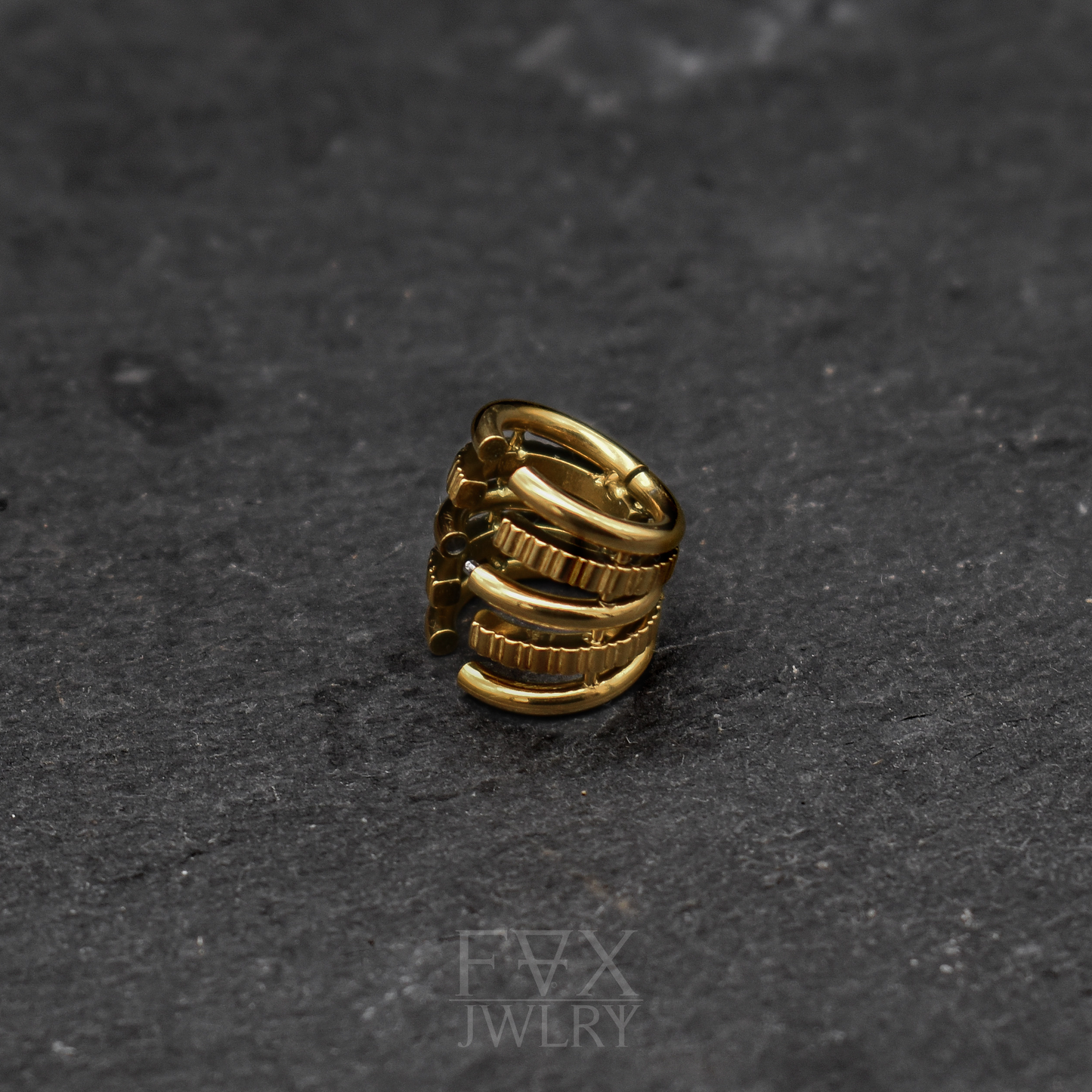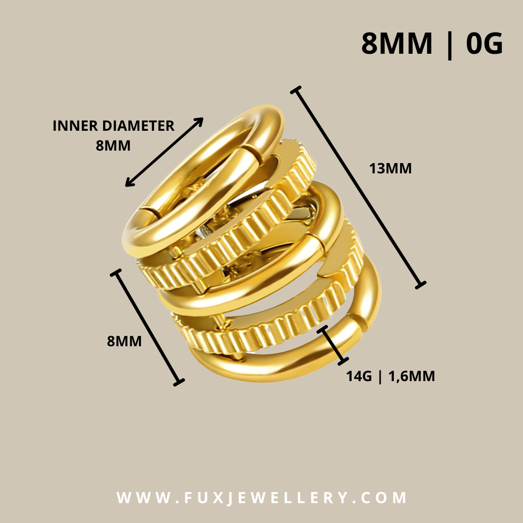 Golden multi-ring ear cuff for stretched lobes. Minimum size 8 mm | 0 g.