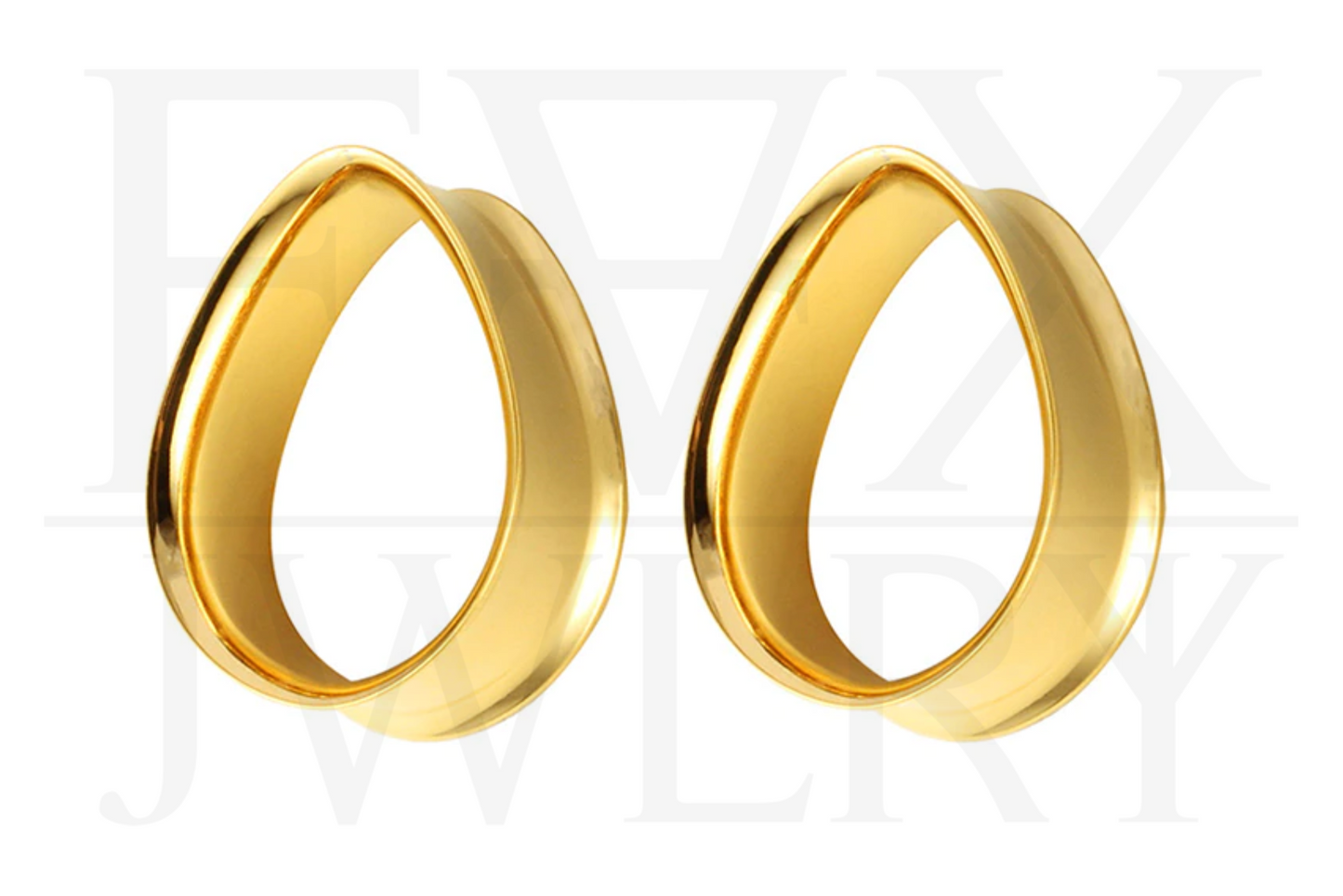 Golden Teardrop shaped flesh tunnels for stretched ear lobes. Light weight and thin double flared design. Great everyday jewelry because they matches perfectly with Hoops, Clicker Ear Weights and Hangers. Also available in silver.