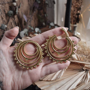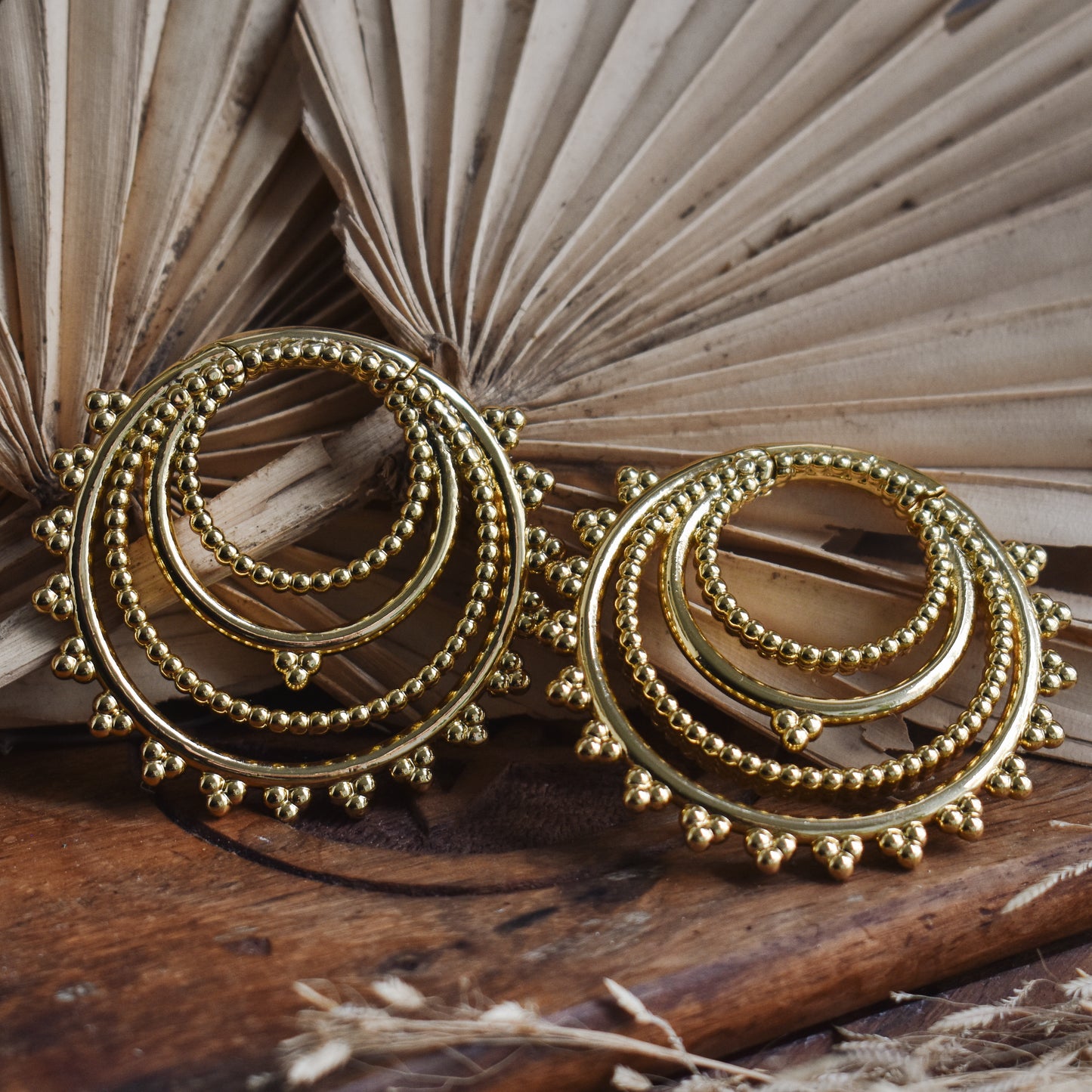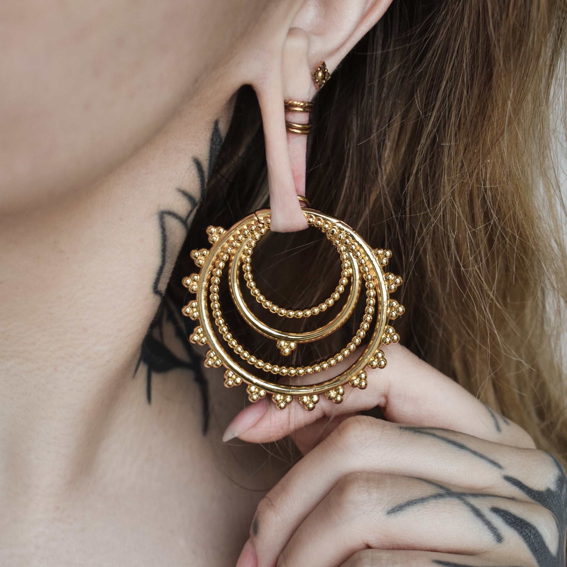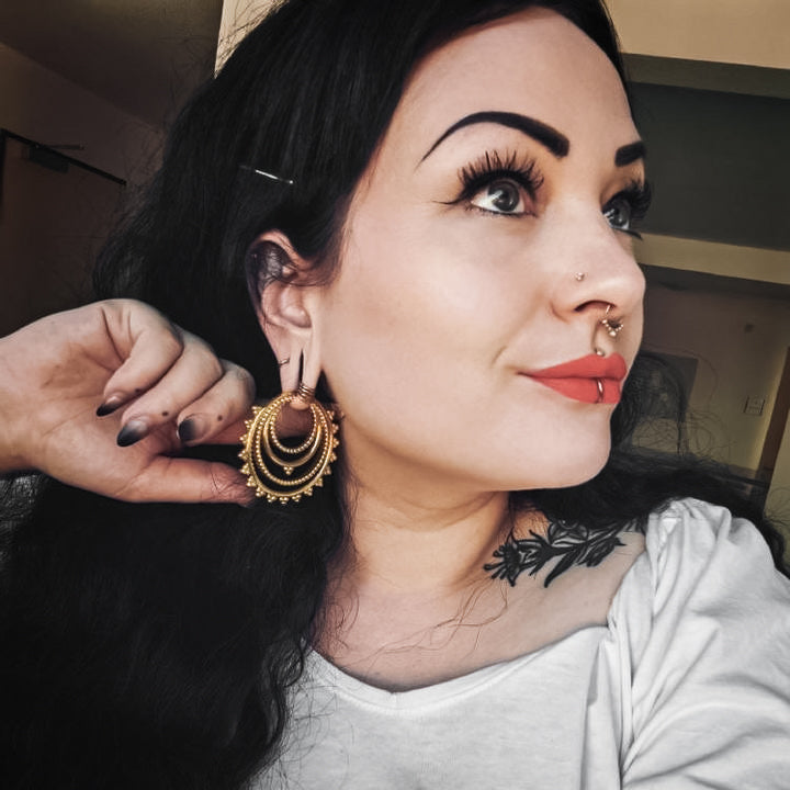 Golden Tribal Hoop Ear Weights with clicker closure. They fit stretched ears starting at least 5 mm | 4 g and above. Wearable through flesh tunnels and saddle spreaders. Also available in silver.
