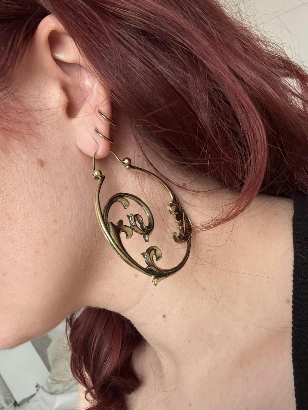 These earrings feature detailed gothic ornaments. They are for standard pierced earlobes and are also perfectly wearable through tunnels and saddle spreaders. Also available in silver.