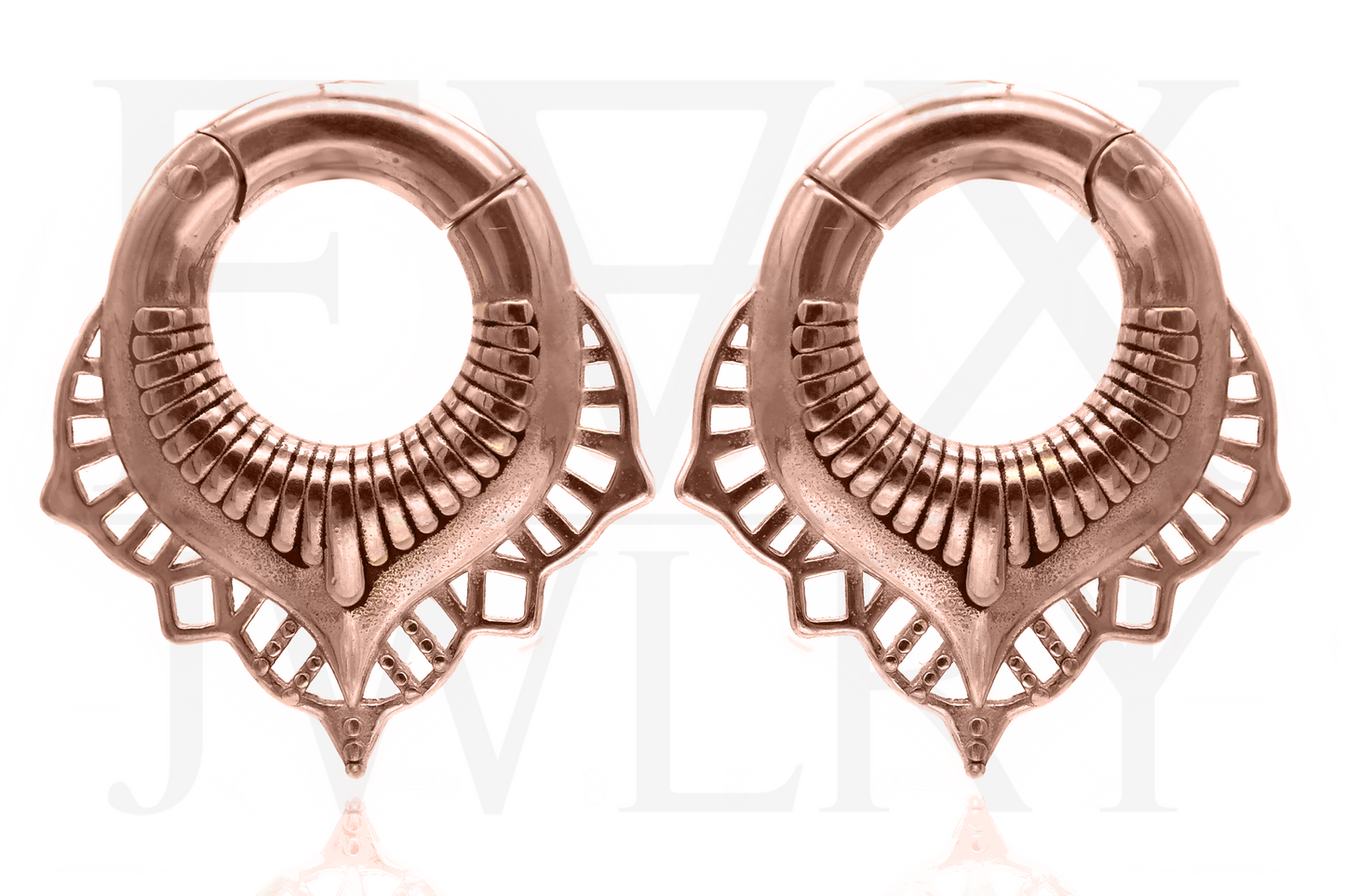 Rose Gold Mandala Clicker Ear Weights for stretched lobes with magnetic clasps. These hangers can fit stretched ears starting at least 6 mm | 2g. This is the minimum required size to wear, you can wear it with all sizes above. Also available in silver and gold.