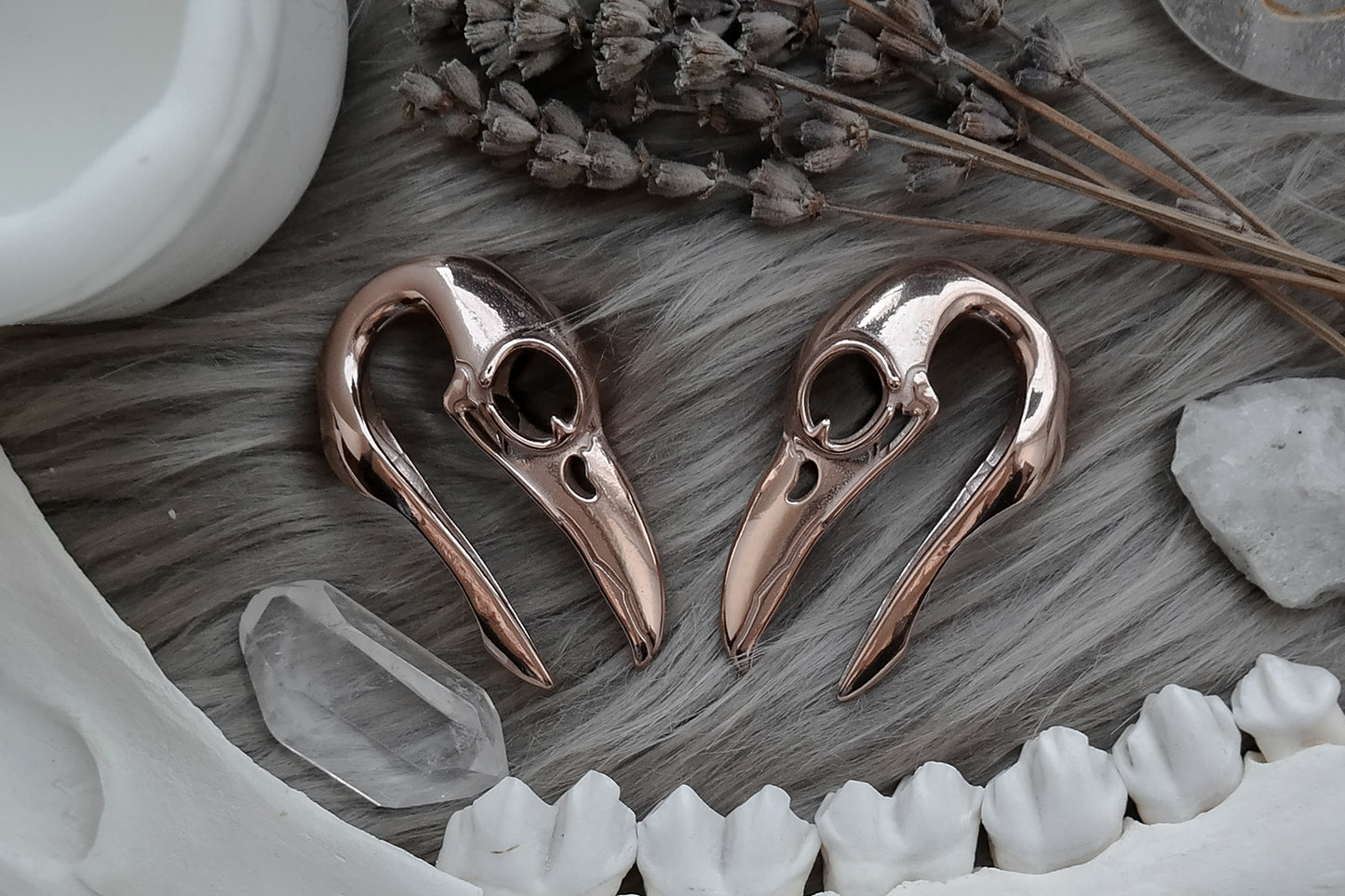 Rose Gold Raven Skull Ear Weights. Also available in silver, gold and black. Must be at least 10 mm | 00g to wear.