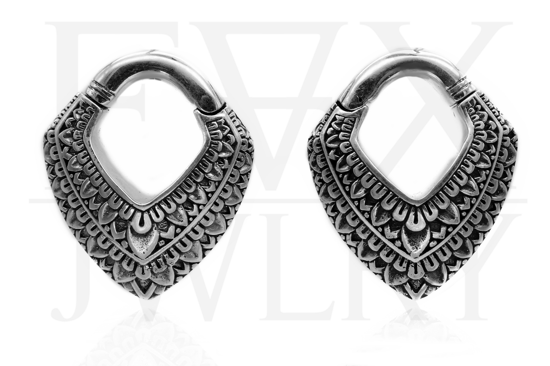 Silver Aura Ear Weights for stretched lobes with clicker closure. Large eye catching ear hangers with stunning tribal design. These weights can fit stretched ears starting at least 8 mm | 0 g and above. Also available in gold.