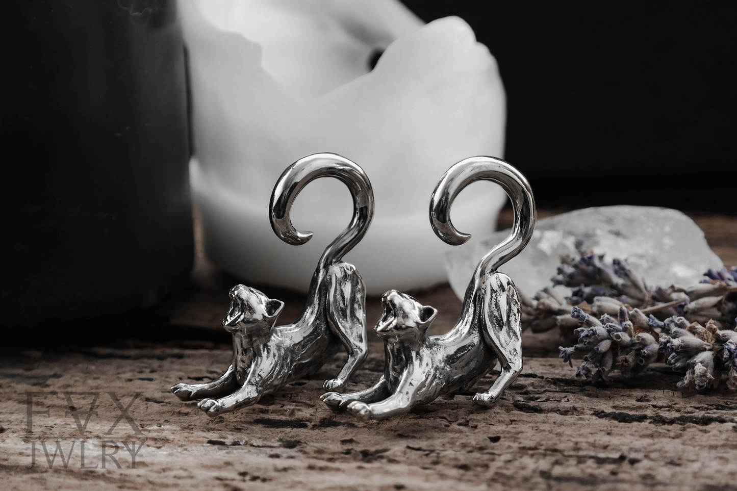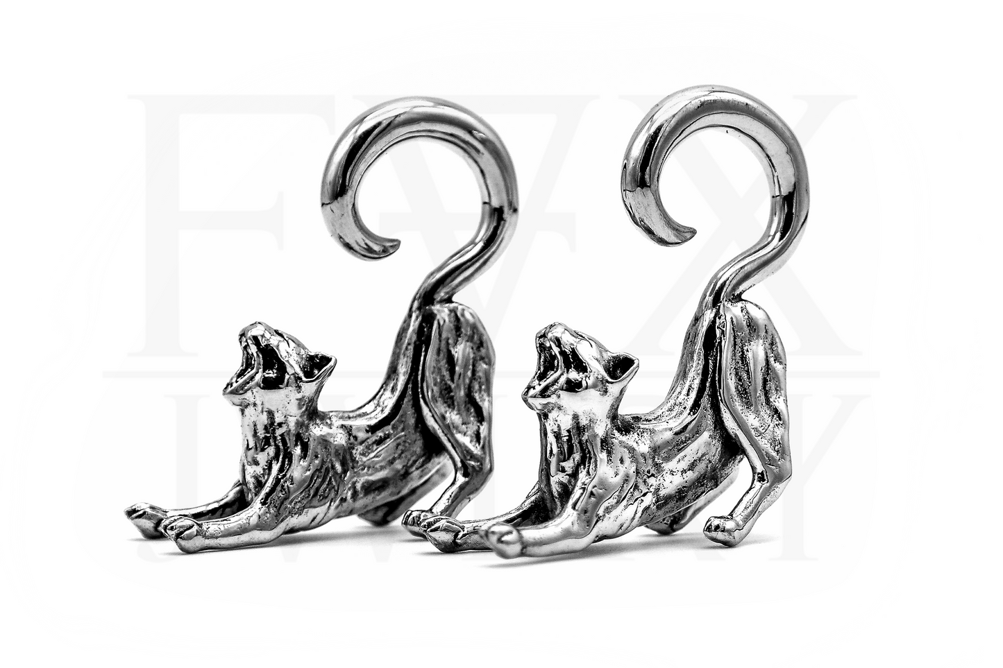 Silver Cat Ear Weights for stretched lobes. Very detailed double sided design. These hangers can fit stretched ears starting at least 4 mm | 6g. This is the minimum required size to wear, you can wear it with all sizes above. Also available in gold.