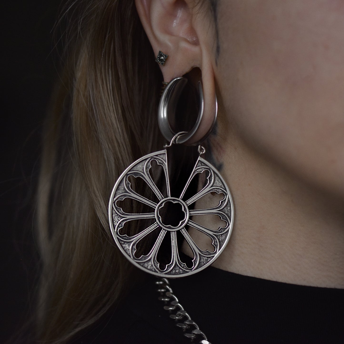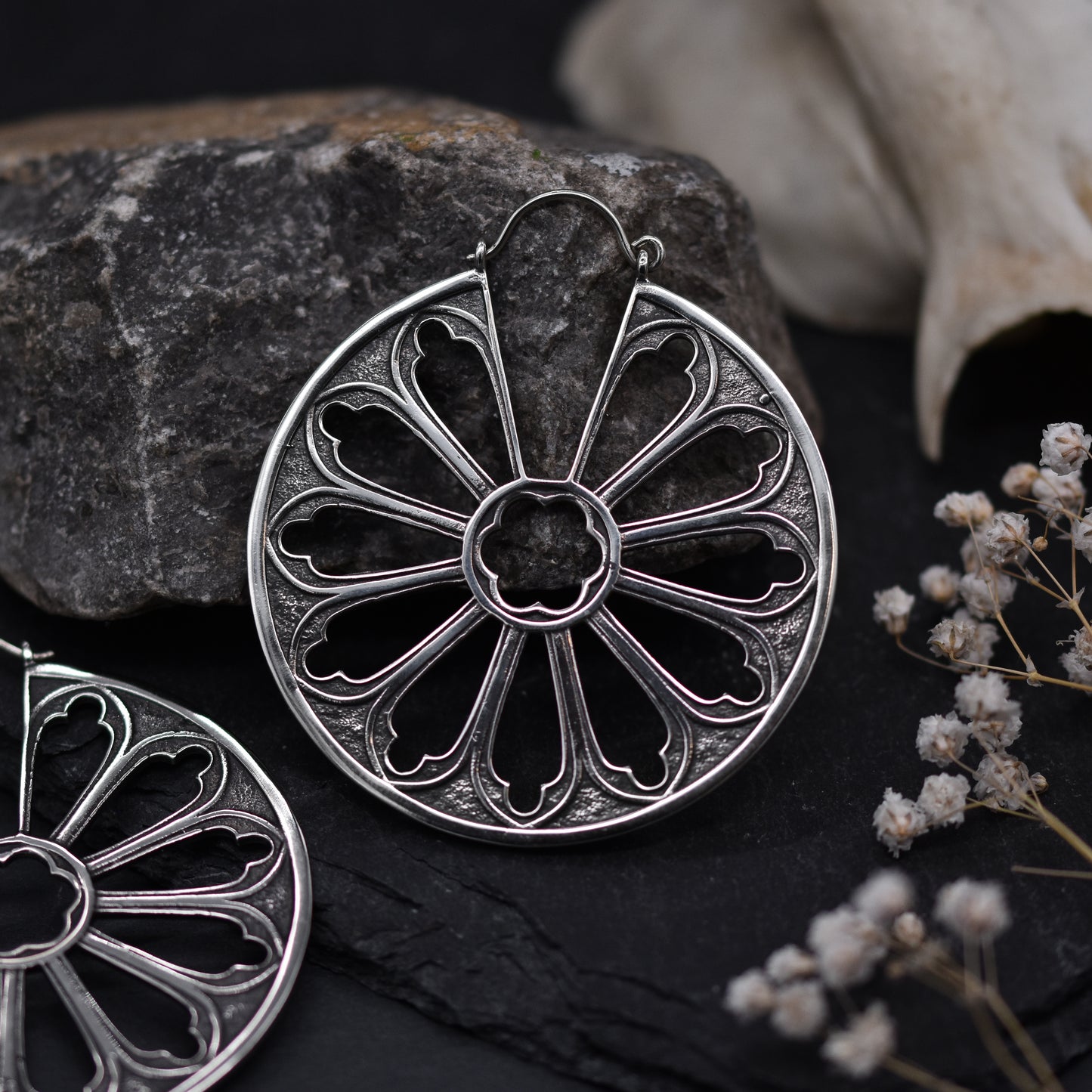 These Silver Cathedral Window Earrings have a stunning double-sided design, showcasing a beautifully detailed gothic rose window on each side. They'll add a unique touch to any outfit. These hoops are also wearable perfect through tunnels and saddle spreaders. Also available in Gold.